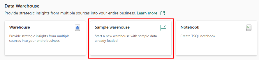 Once you have created your warehouse, you can load sample data into warehouse from Use sample database card on the home page of the warehouse.