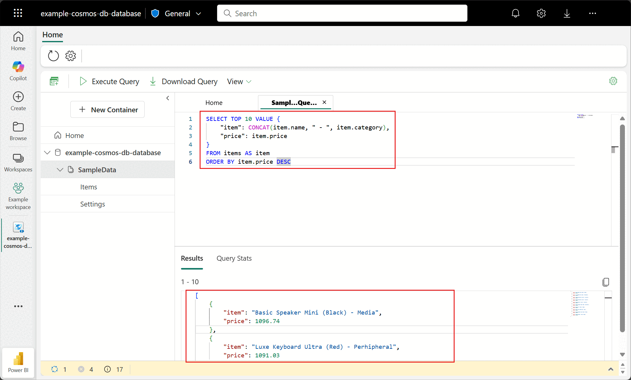 SELECT TOP 10 VALUE { "item": CONCAT(item.name, " - ", item.category), "price": item.price } FROM items AS item ORDER BY item.price DESCObserve the results of the query in the query editor.