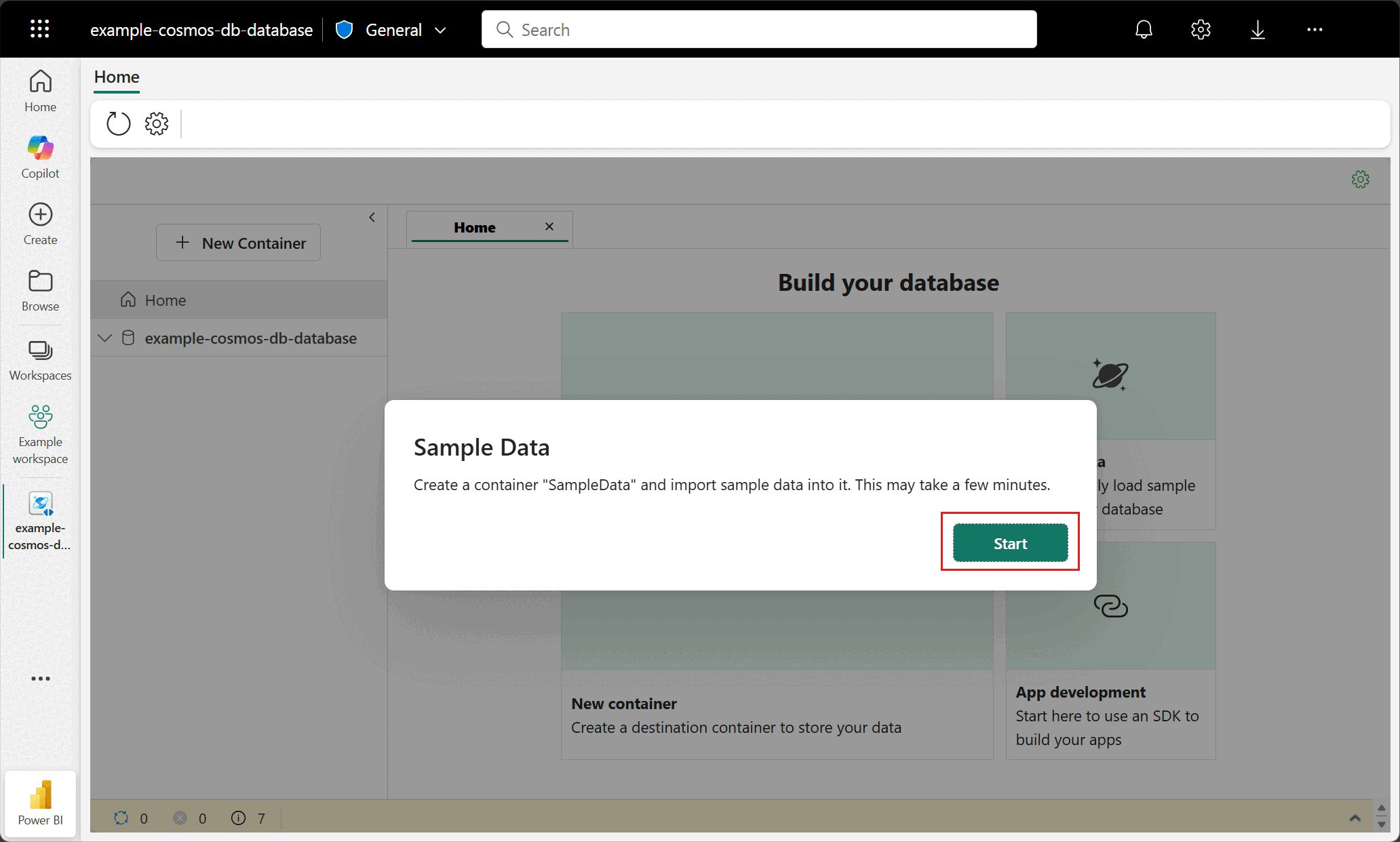 A dialog appears informing you that the import operation could take a few minutes. Select Start to begin importing the sample data set.