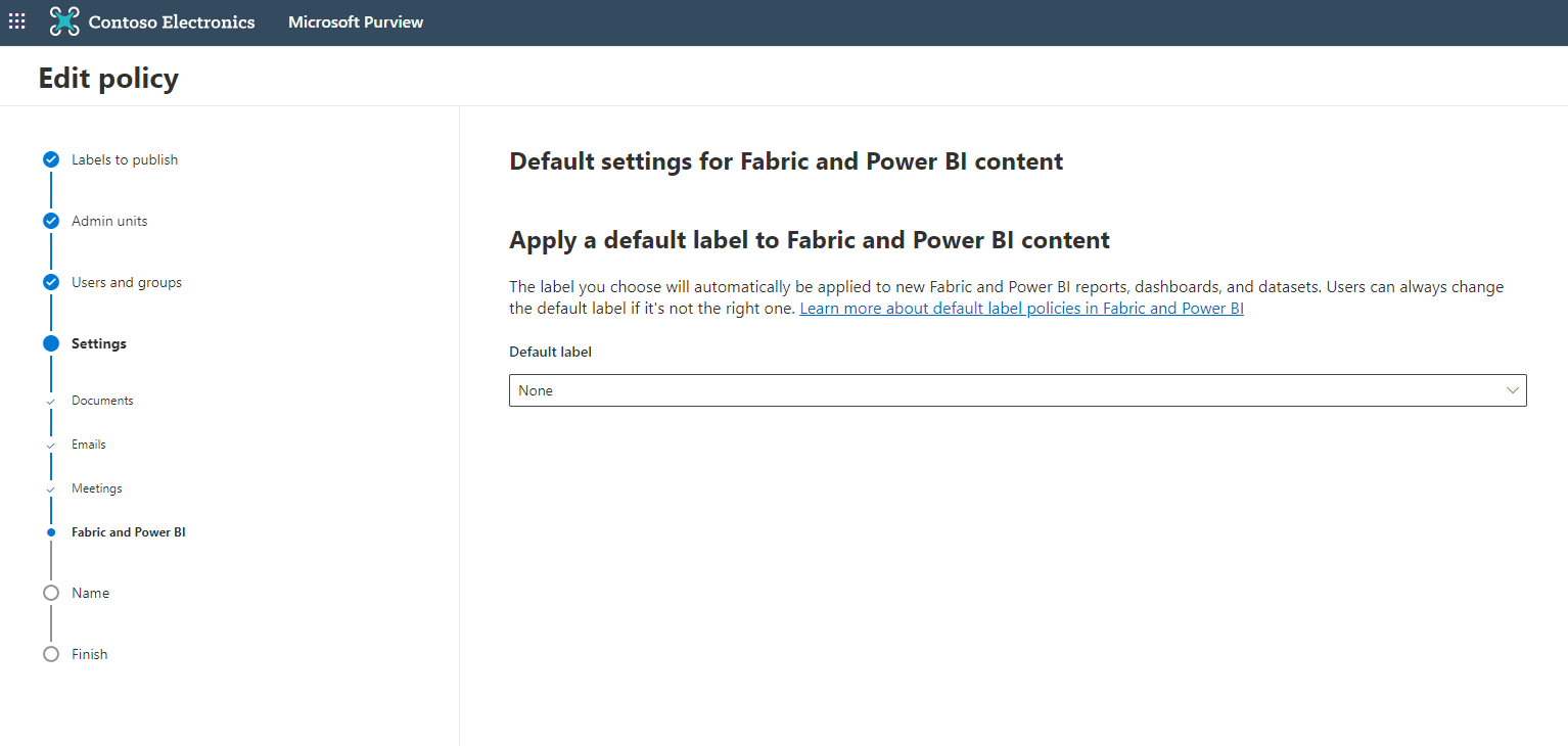 A Microsoft 365 administrator can enable a default label policy for Fabric and Power BI by selecting the desired label in the Apply this default label to Power BI content dropdown menu in the policy settings for Power BI in the Microsoft Purview compliance portal. For more information, see What label policies can do.