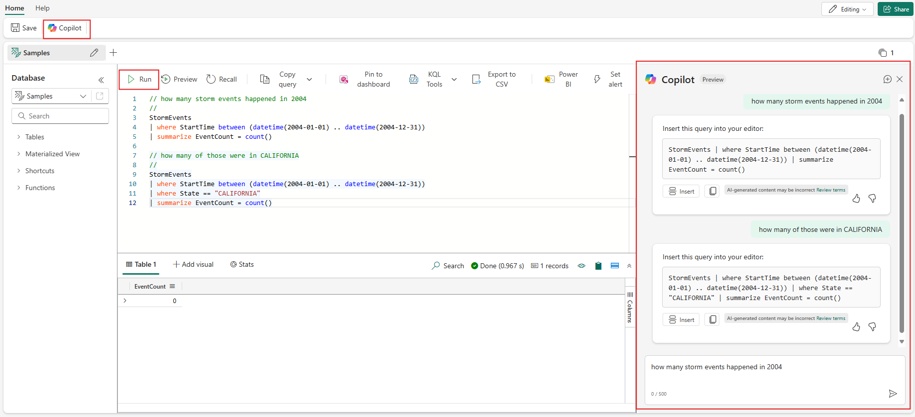 • Copilot doesn't automatically run the generated KQL query. Users are advised to run the queries at their own discretion.