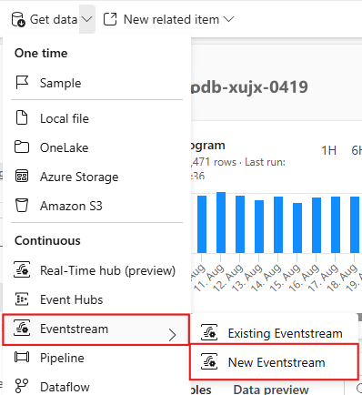 On the ribbon of your KQL database, select Get data > New Eventstream. For a lakehouse, only the New Eventstream option is available as an eventstream data source.