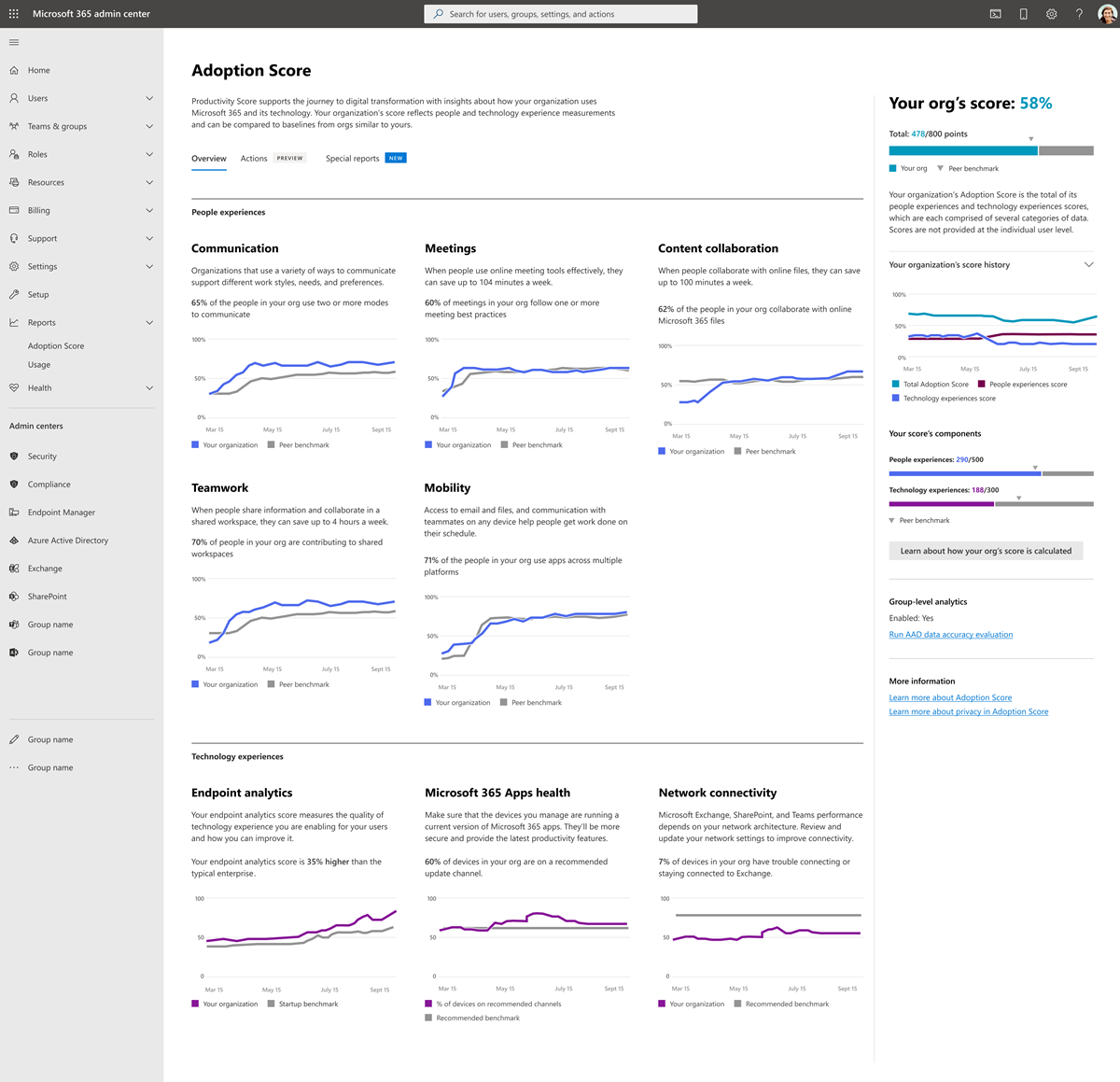 Adoption Score supports the journey to digital transformation with insights about how your organization uses Microsoft 365 and the technology experiences that support it. Your organization's score reflects people and technology experience measurements and can be compared to benchmarks from organizations similar in size to yours.