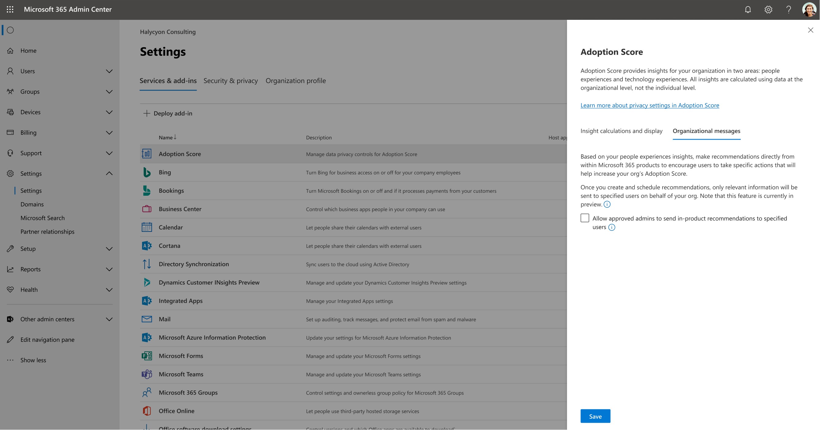 After Adoption Score is enabled, the global administrator and organizational message writer role can opt in for Adoption Score Organizational Message.