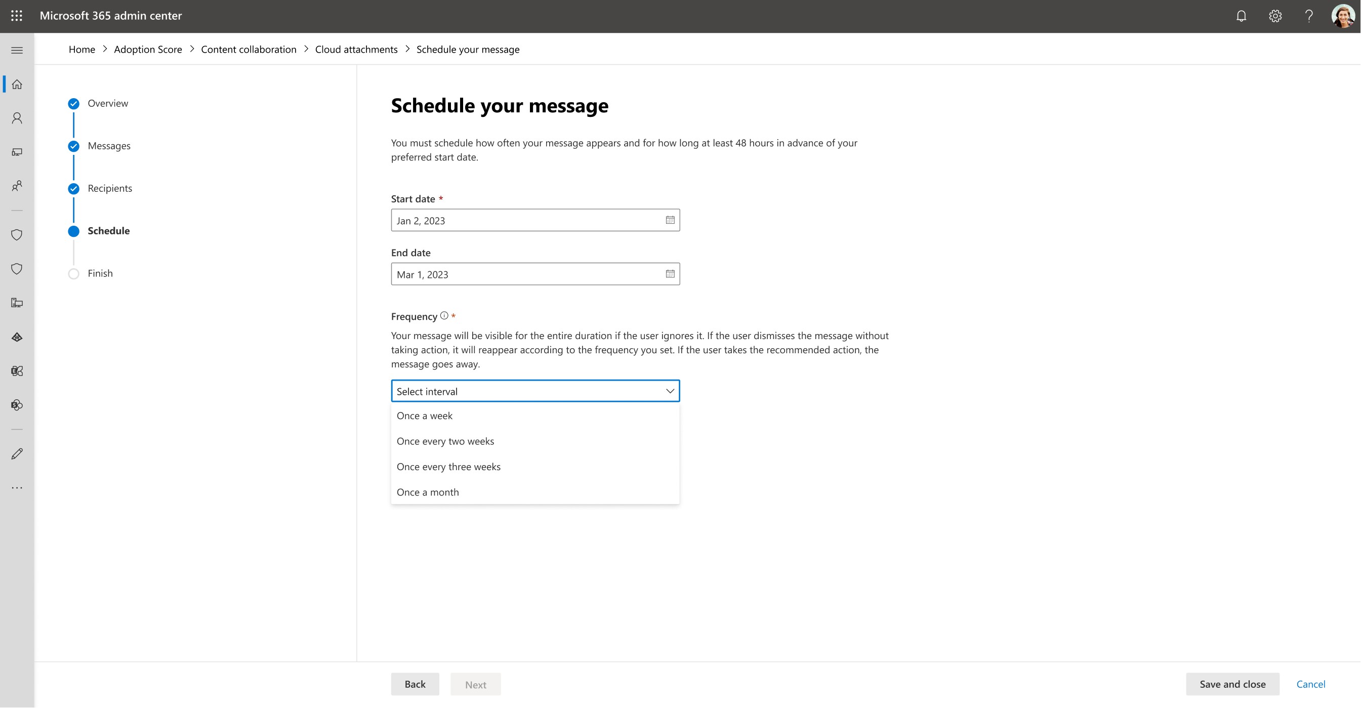As the frequency of the messages is at most once a week, the recommended minimum duration is one month. The recommended length of the time window is 12 months. The recipient's list is refreshed daily. Your messages will always be sent to users who haven't adopted the recommended practices in the last 28 days. Messages won't repeatedly send to users who have already adopted.