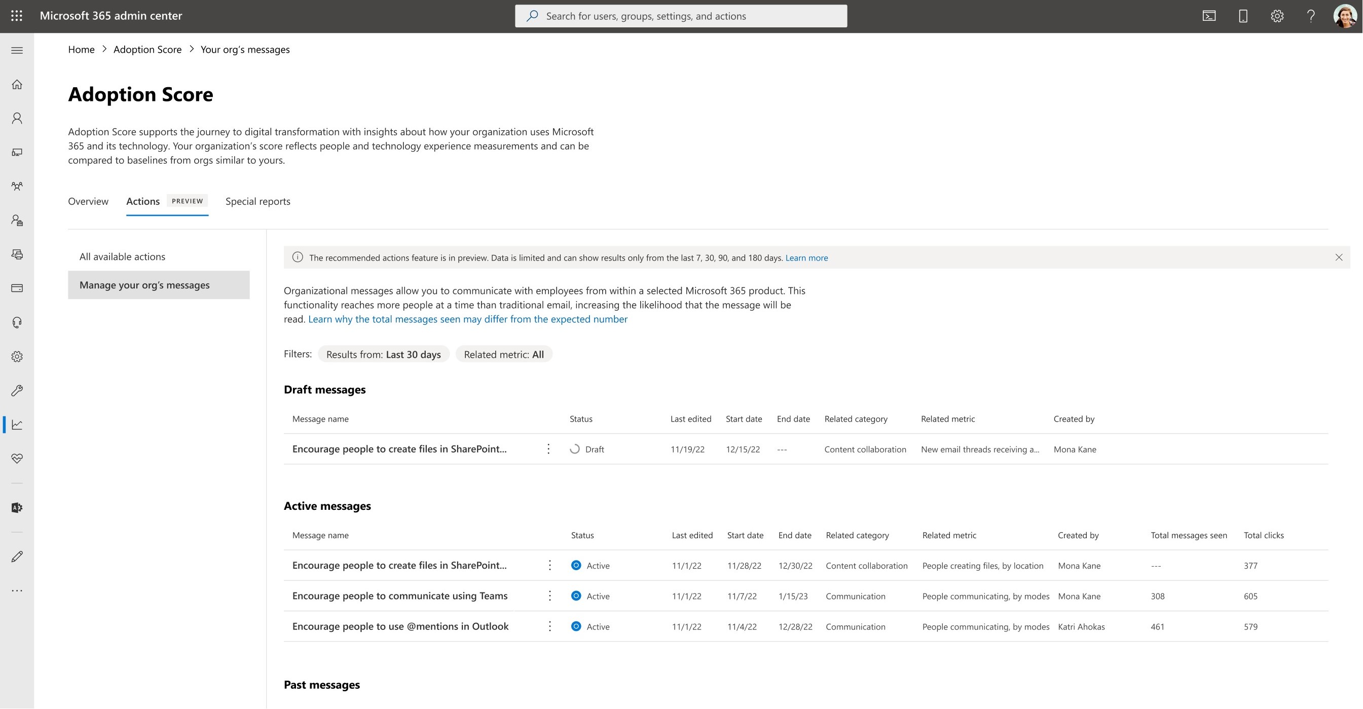 Organizational messages for Adoption Score will initially roll out to Communication, Content Collaboration, Mobility, and more to follow to support all People Experience categories.