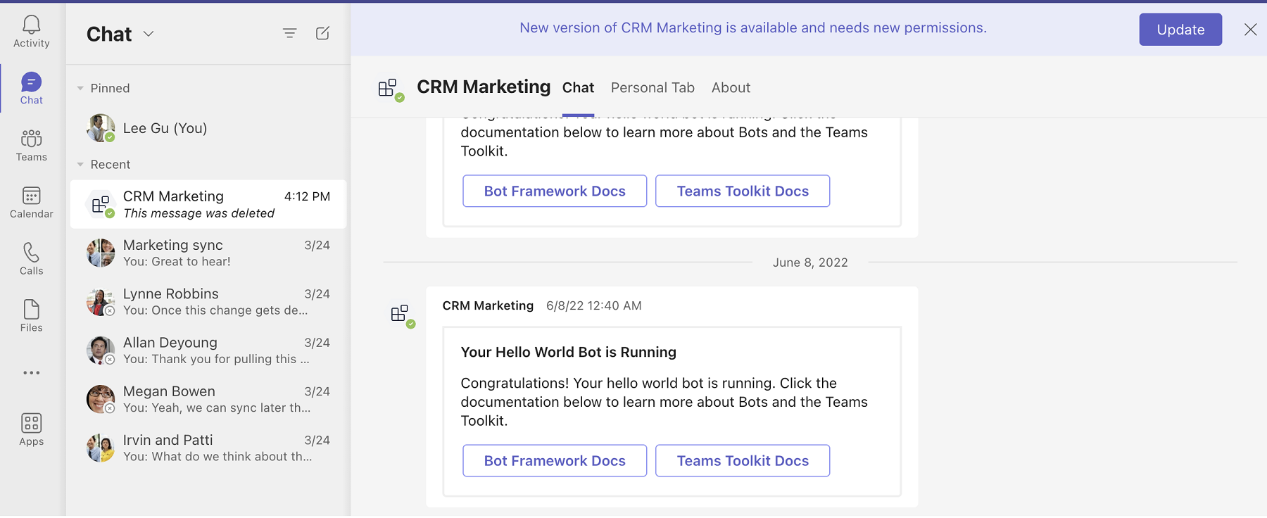 botIdproperty in the app manifest file) and the chat history is left as is to preserve it. The icon and name of the previous bot reverts to the values that the developer provided when registering their bot in Microsoft Bot Framework. The previous bot doesn't display the icon or the name of the new version of the app. The previous bot doesn't belong to any app (asbotIdisn't mentioned in app manifest file) and hence app permission policies don't apply to it.