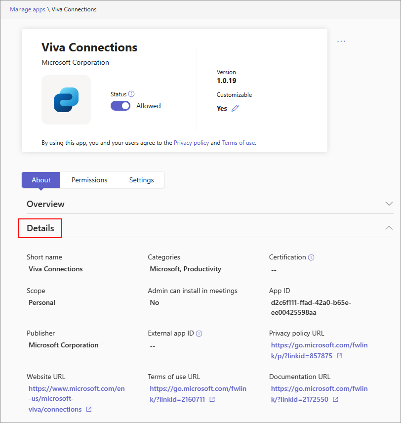 App details page of the app in Manage apps page in Teams admin center.
