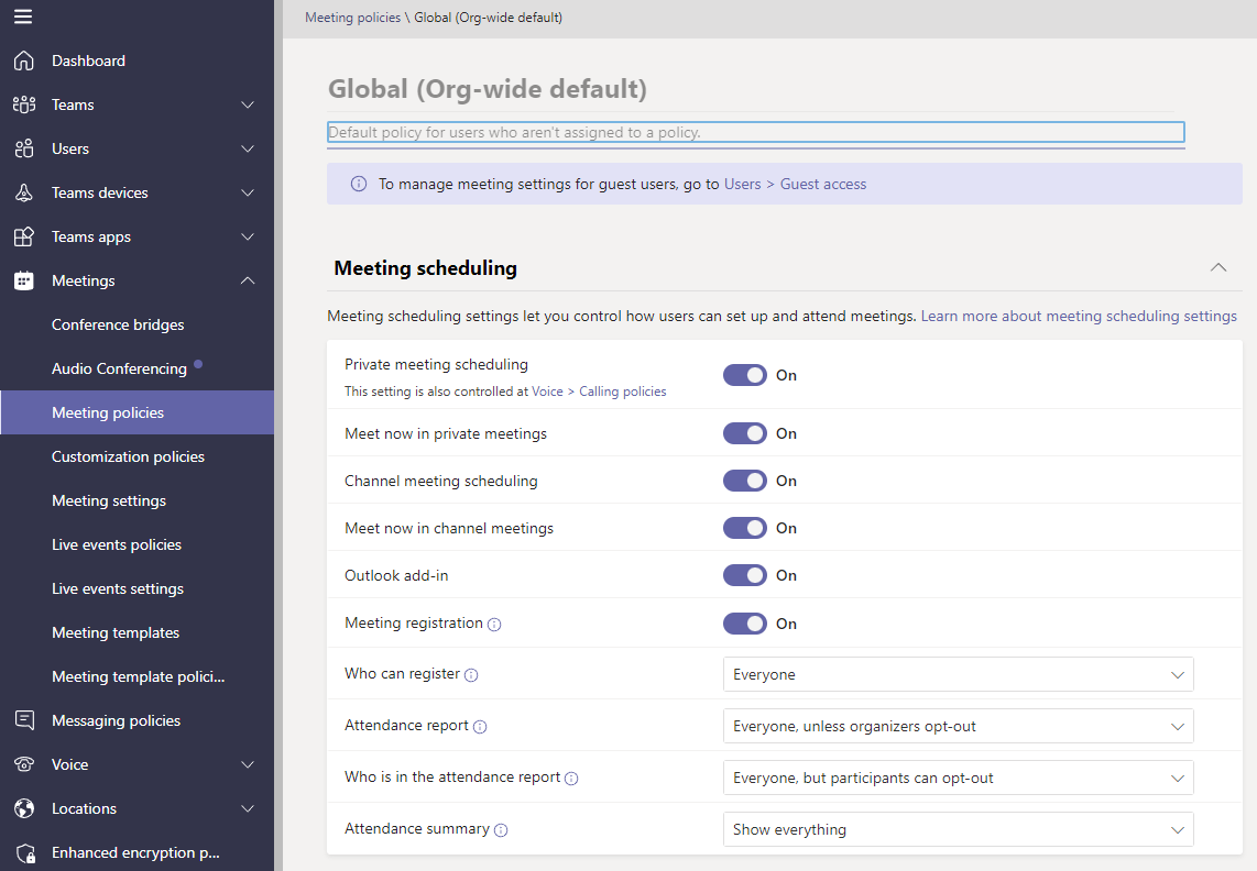 Each policy has multiple controls which you can use to choose the options you want to use for your organization. For example, meeting policies allow you to specify meeting scheduling options for the people in your organization.