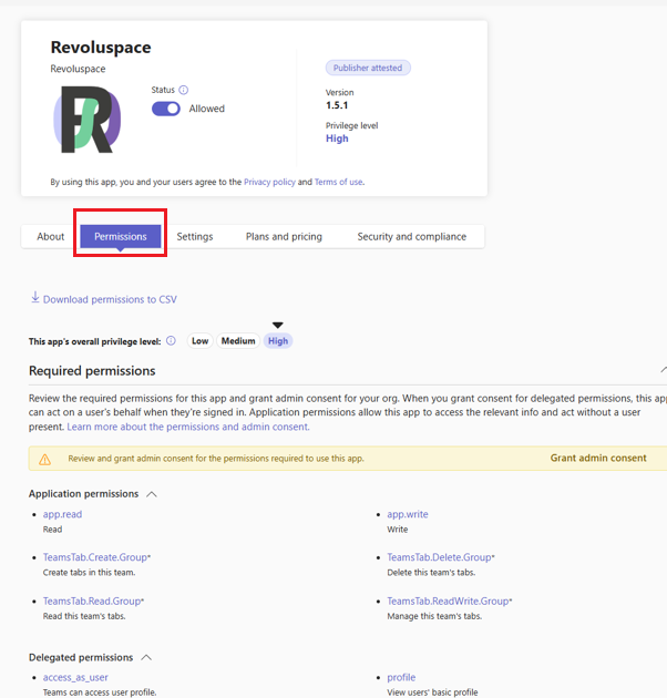 Teams admin center helps you quickly assess security and compliance-related information for agents and apps. This information includes industry-standard data such as SOC 2, HIPAA, ISO 27001, GDPR, CCPA, and FedRAMP, plus Microsoft Entra ID integration for Single Sign-On, Penetration Testing, and CSA STAR compliance. You'll also see privilege-level insights and permission risk ratings powered by MDA.