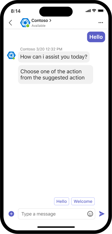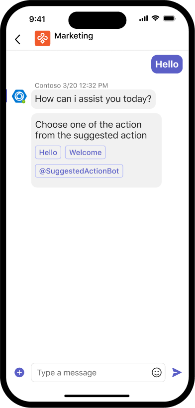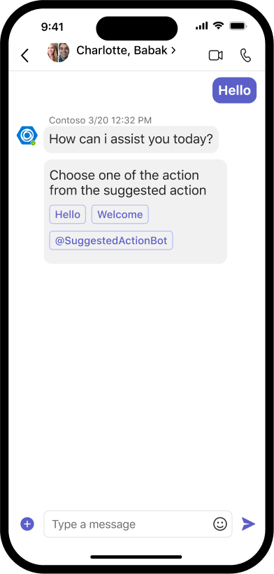 personal: In one-on-one chats, actions are shown as smart replies, so only the actions from the last message appear.teamandgroupChat: In group chats and channels, actions are always saved with the message.