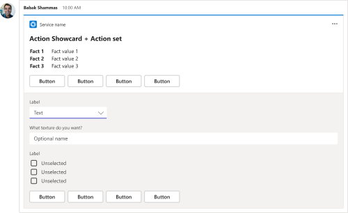 An Adaptive Card contains a freeform body of card elements and optional set of actions. Adaptive Cards are actionable snippets of content that you can add to a conversation through a bot or message extension. Using text, graphics, and buttons, these cards provide rich communication to your audience.