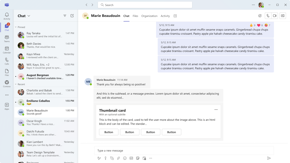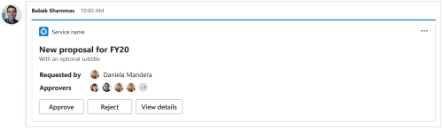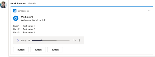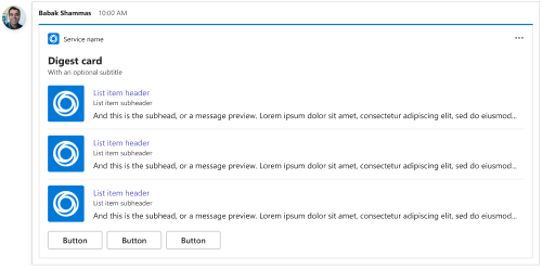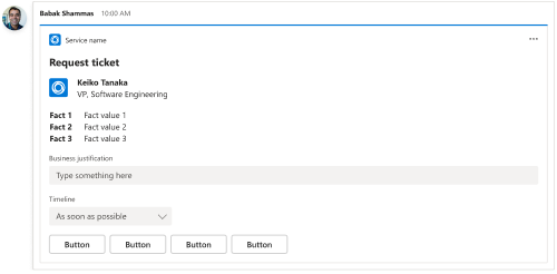 You can find more comprehensive design guidelines for Adaptive Cards in Teams, including elements that you can grab and modify as needed, in the Microsoft Teams UI Kit. The UI kit also covers essential topics such as theming, accessibility, and responsive sizing.