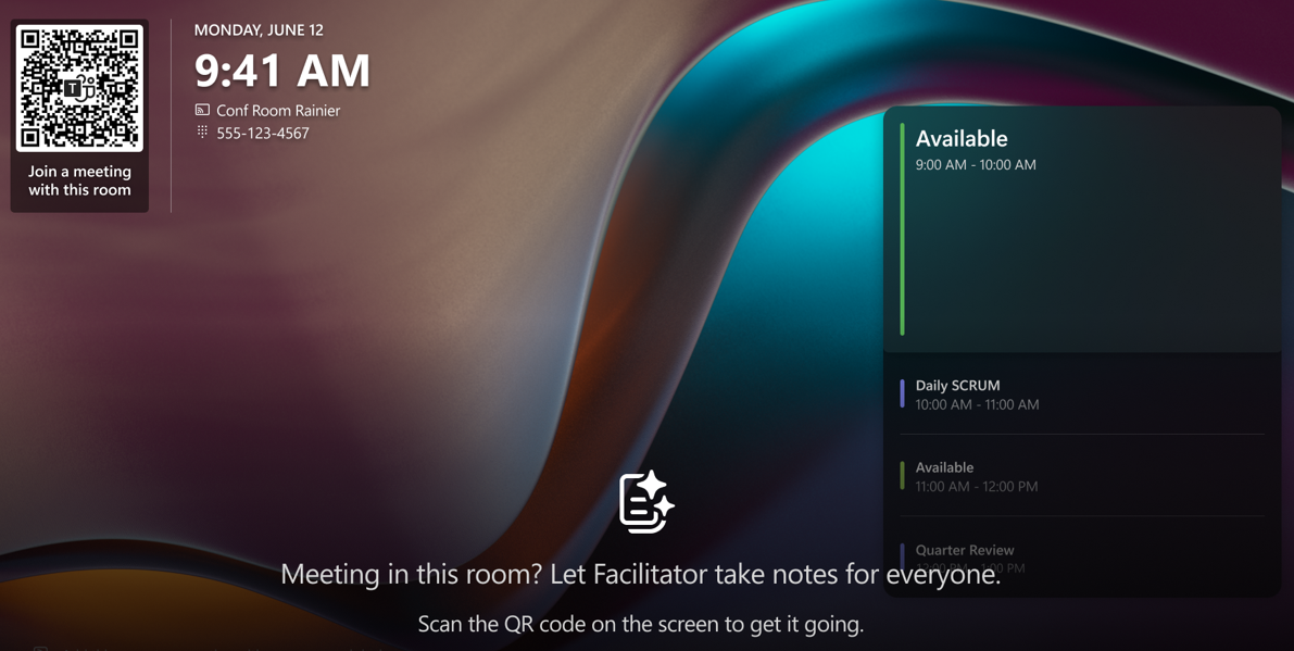 You can use the AI-powered Facilitator agent in Teams Rooms for real-time notes and action items during both scheduled, hybrid, and impromptu or ad hoc in-person meetings. In hybrid meetings, the agent appears in the notes panel. For in-person meetings, scan the QR code on the display to activate the agent as the group's assistant.