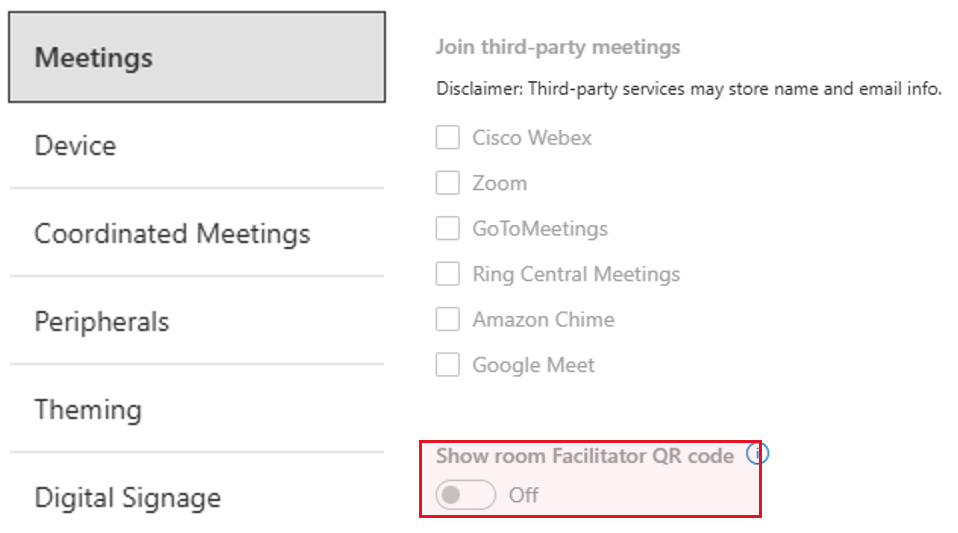 Step 2: Turn on Facilitator for Teams Rooms In the Microsoft Teams Rooms Management portal, go to Room > Settings > Meeting > Facilitator QR Code and toggle it on.
