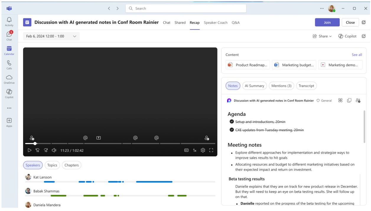 To access the notes after the meeting, navigate to the Recap section in your Teams calendar or chat. The meeting is titled Discussion with AI-generated notes in.
