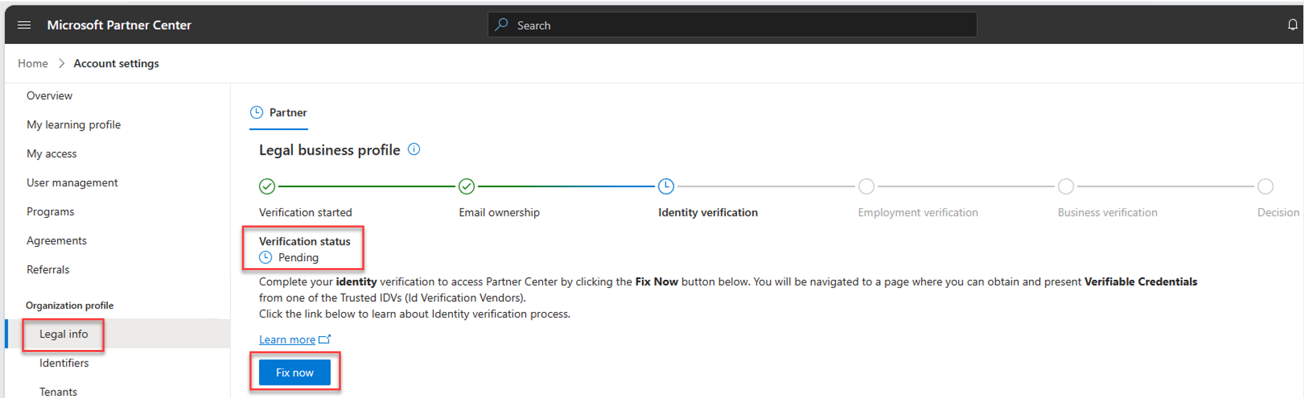 Complete your identity verification to access Partner Center programs by obtaining and presenting verified credentials (VCs) issued by a trusted ID verification vendor (IDV).