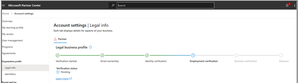Once the verified credential is shared with Partner Center, then the vetting and onboarding process proceeds to employment verification.