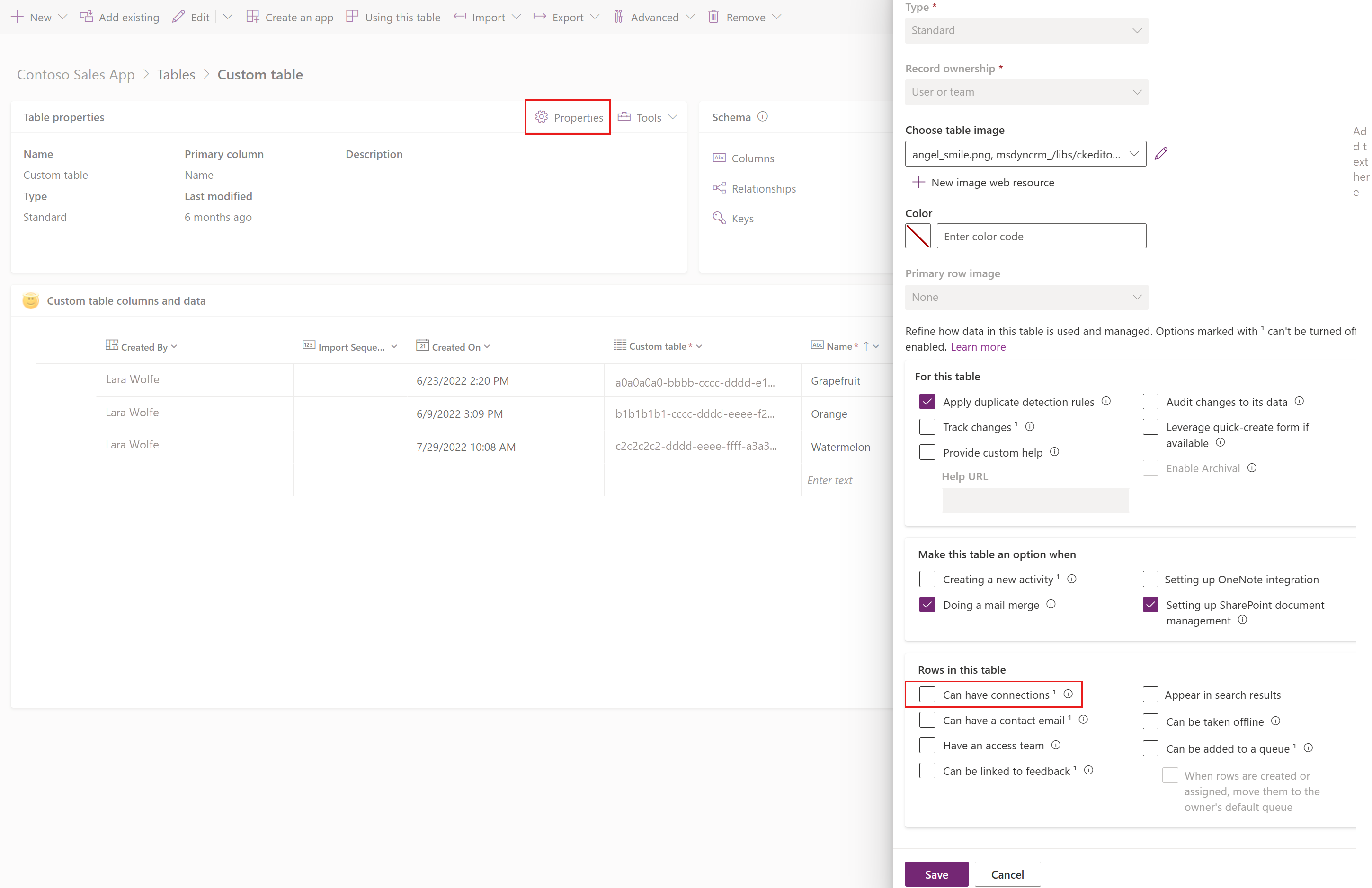 For a table to be available as a row type for a new or existing connection role, the Can have connections property must be enabled for the table.