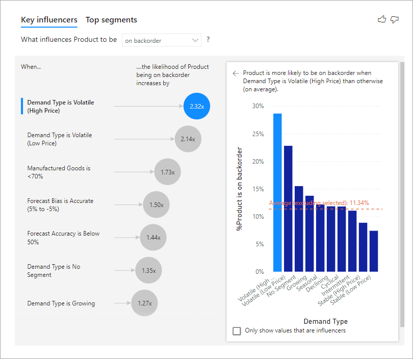 Key influencers are a great choice to help you understand the factors that influence a key metric. For example, what influences customers to place a second order or why were sales so high last June.