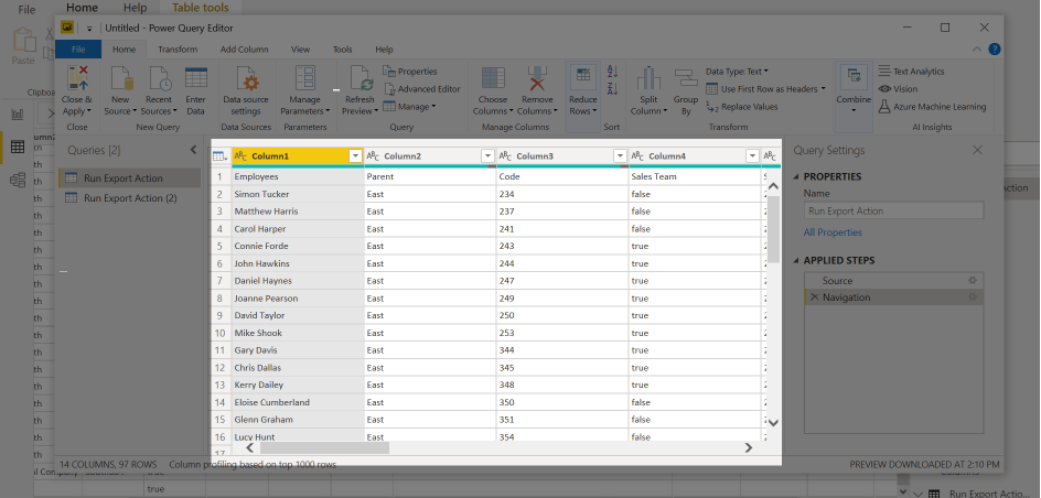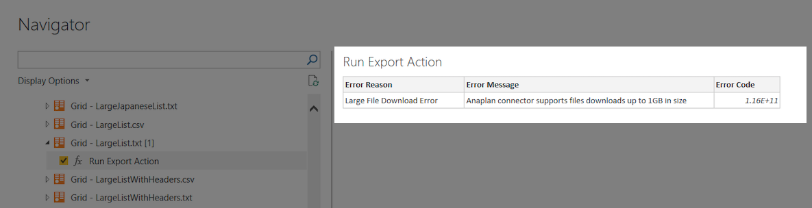 The Anaplan connector for Power BI uses exports to download data from your Anaplan model. Make sure you have an export action set. The navigator step is where you load and run these exports.