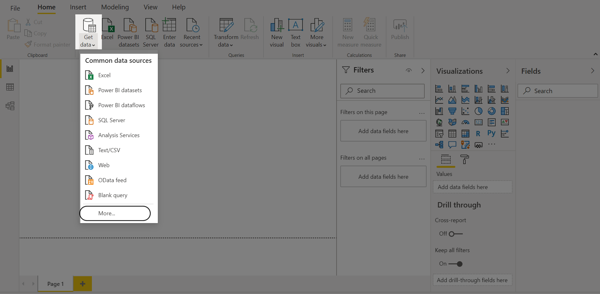 Select Get data from the ribbon menu, which displays the Common data sources menu.