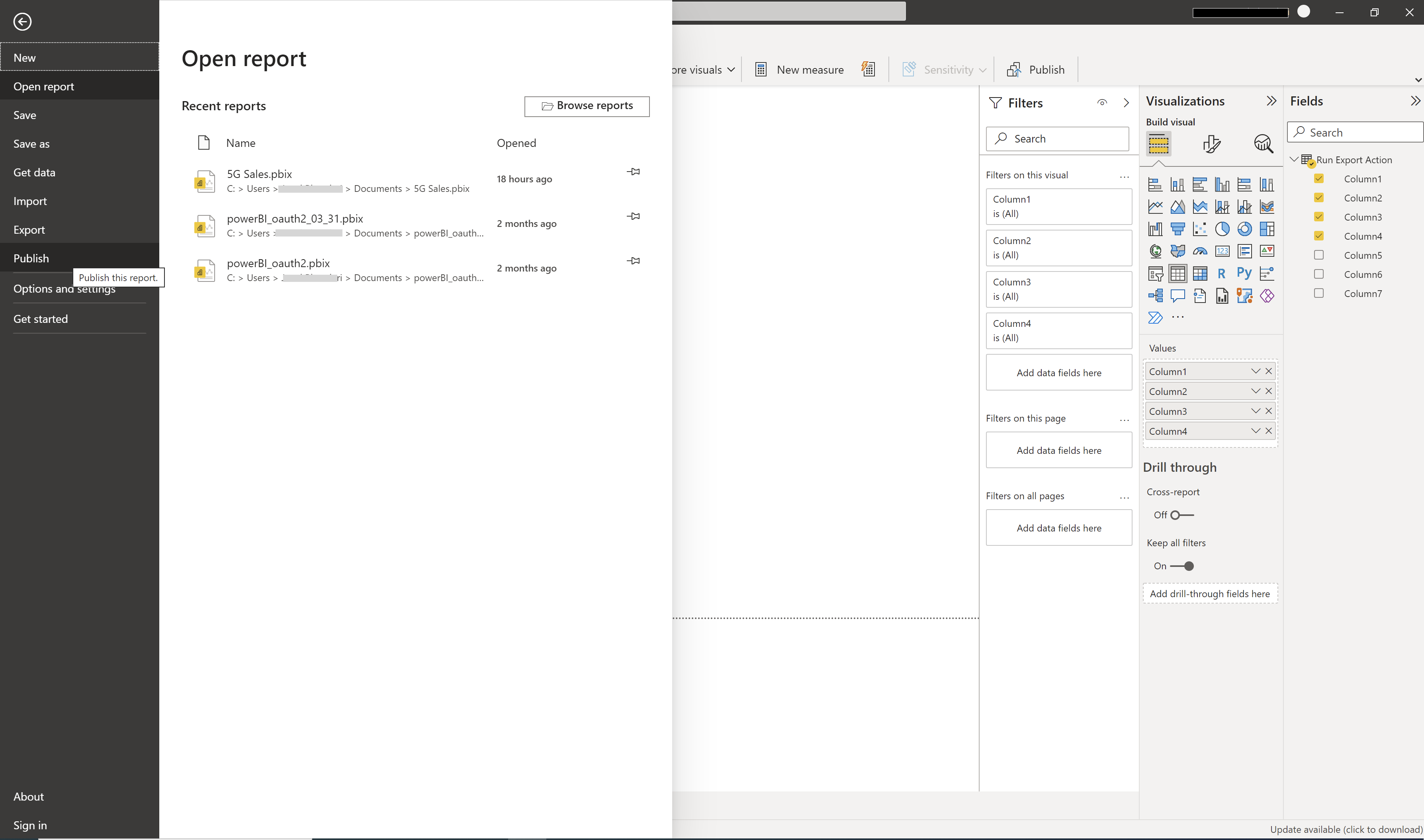 To publish a report to Power BI service, select Publish from the Power BI Desktop report dialog.