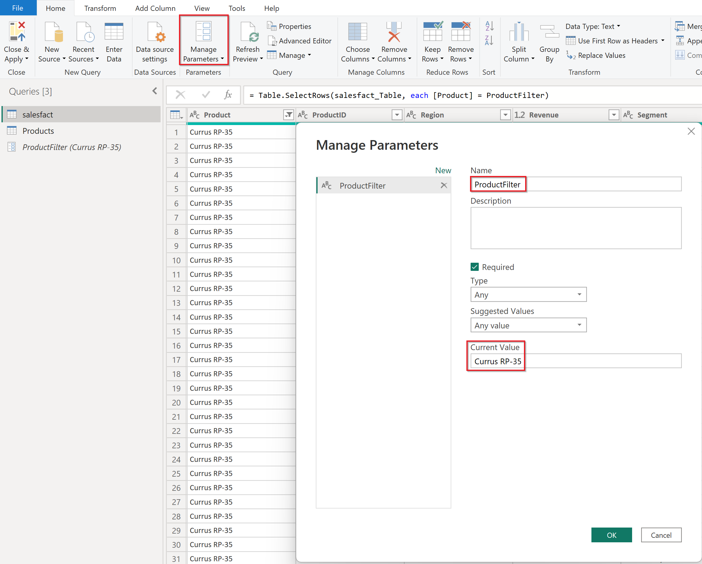 In the Power Query editor, select Manage Parameters > New Parameter. Rename the new parameter to reflect the filter parameter and input a valid value as Current Value.