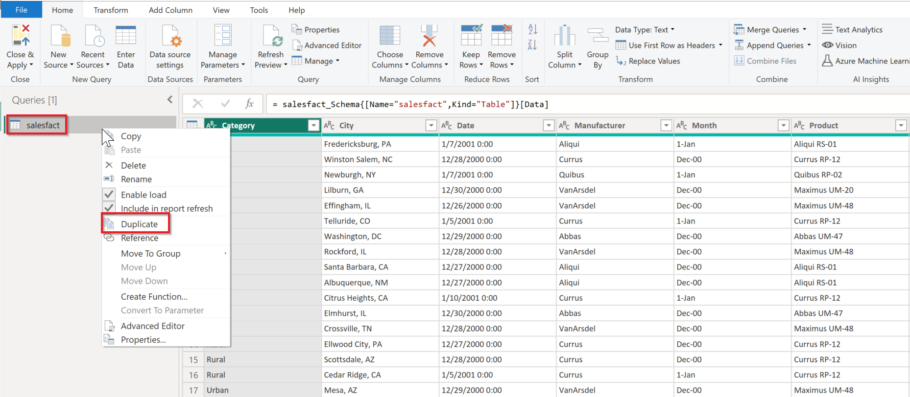 In Navigator, select Transform Data instead of Load to bring up the Power Query editor. Right-click on the queries data set, and then select Duplicate to create a new data set.