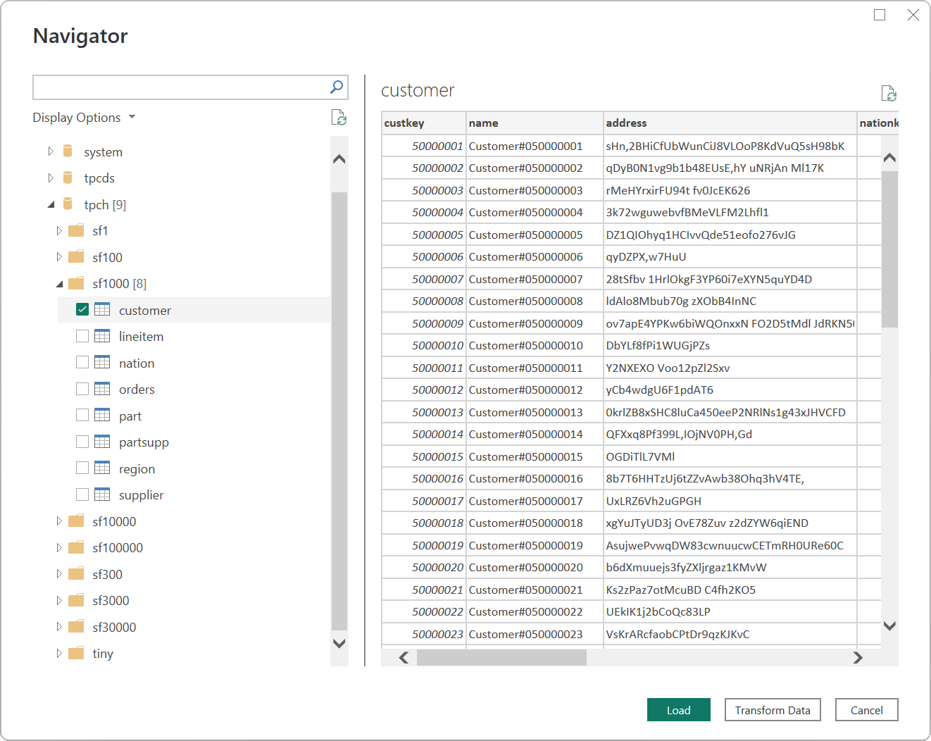 In Navigator, expand the catalog and schema to reveal the table you want, then either select Load to load the data or Transform Data to continue transforming the data in Power Query Editor.