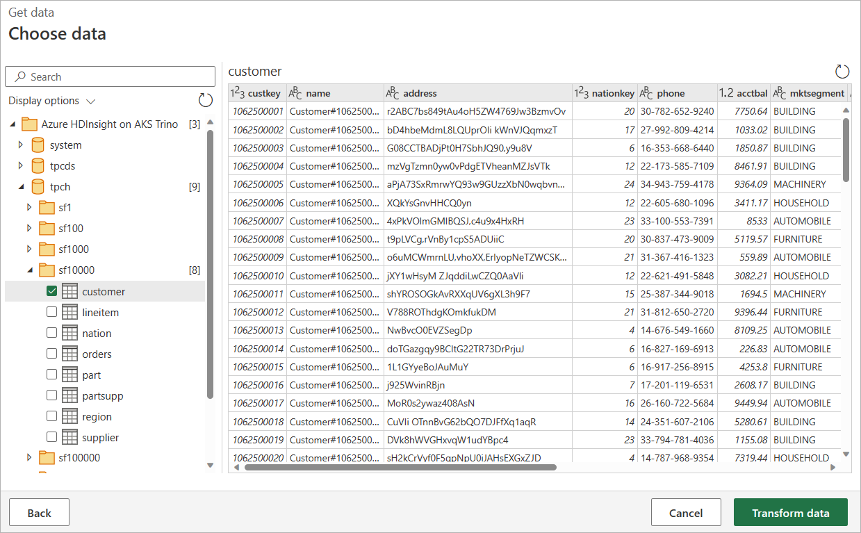In the Get Data experience, search for and select Azure HDInsight on AKS Trino. More information: Where to get data
