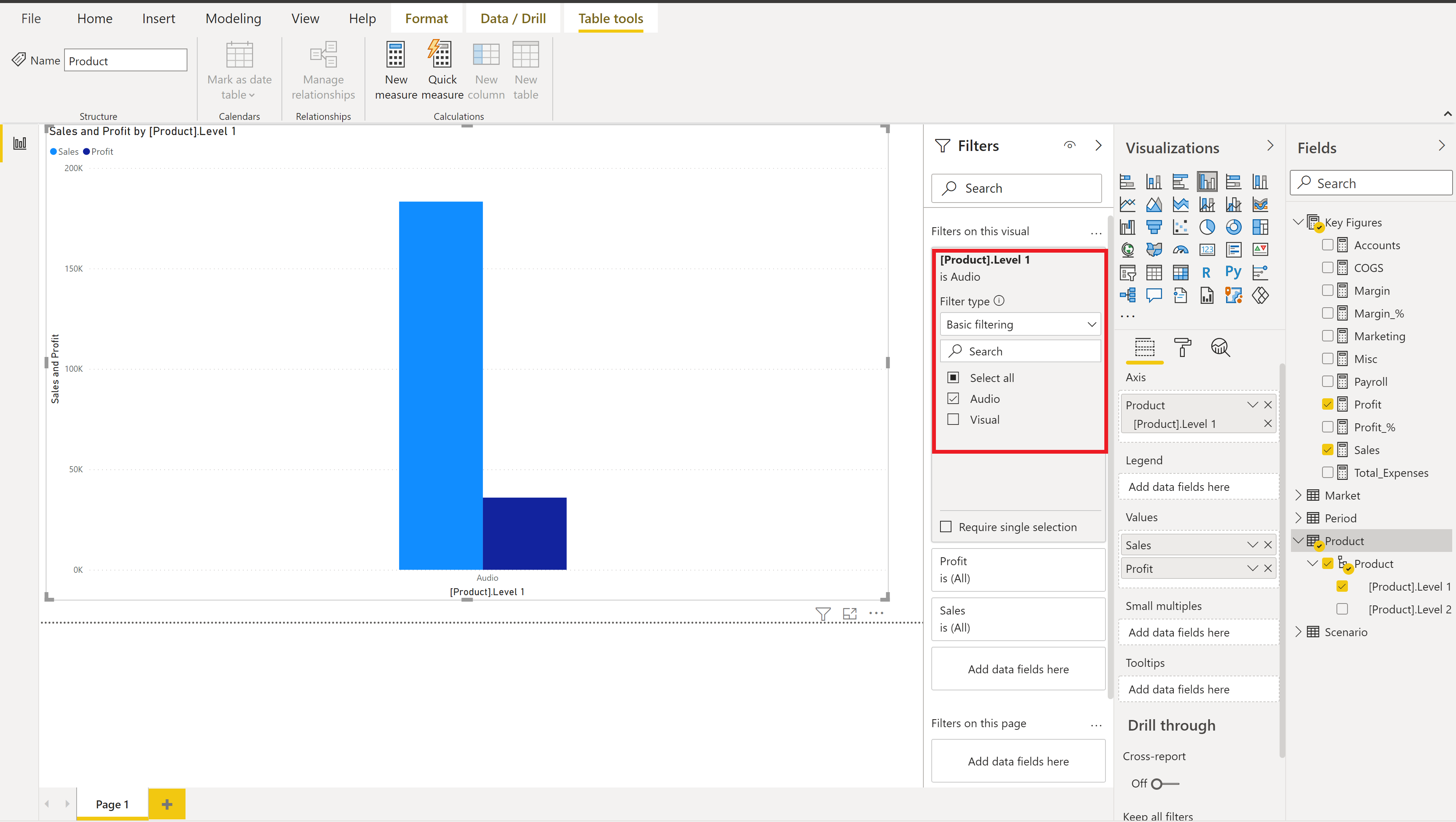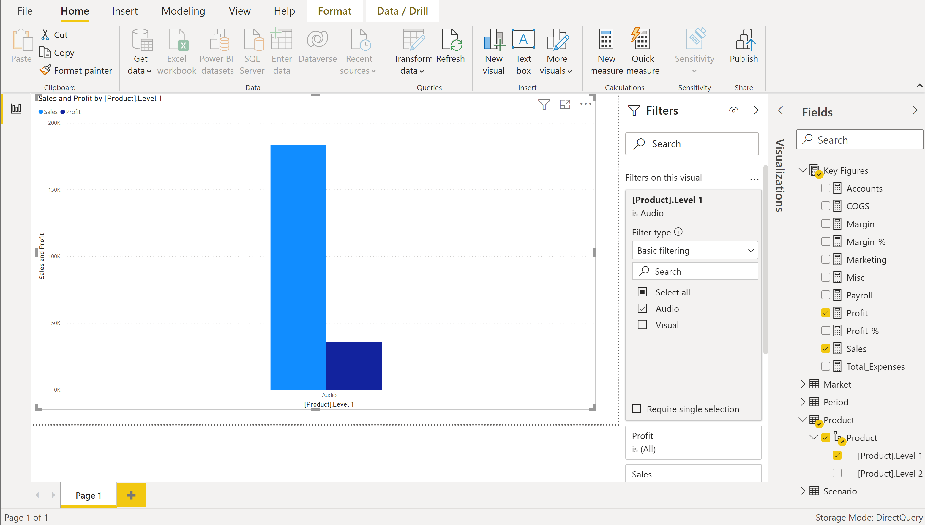 When you've finished choosing the members you want in the dimension level filter, it's a good time to add that dimension level to your visualization. Check the matching dimension level in the Fields pane and it's then added to your current visualization.