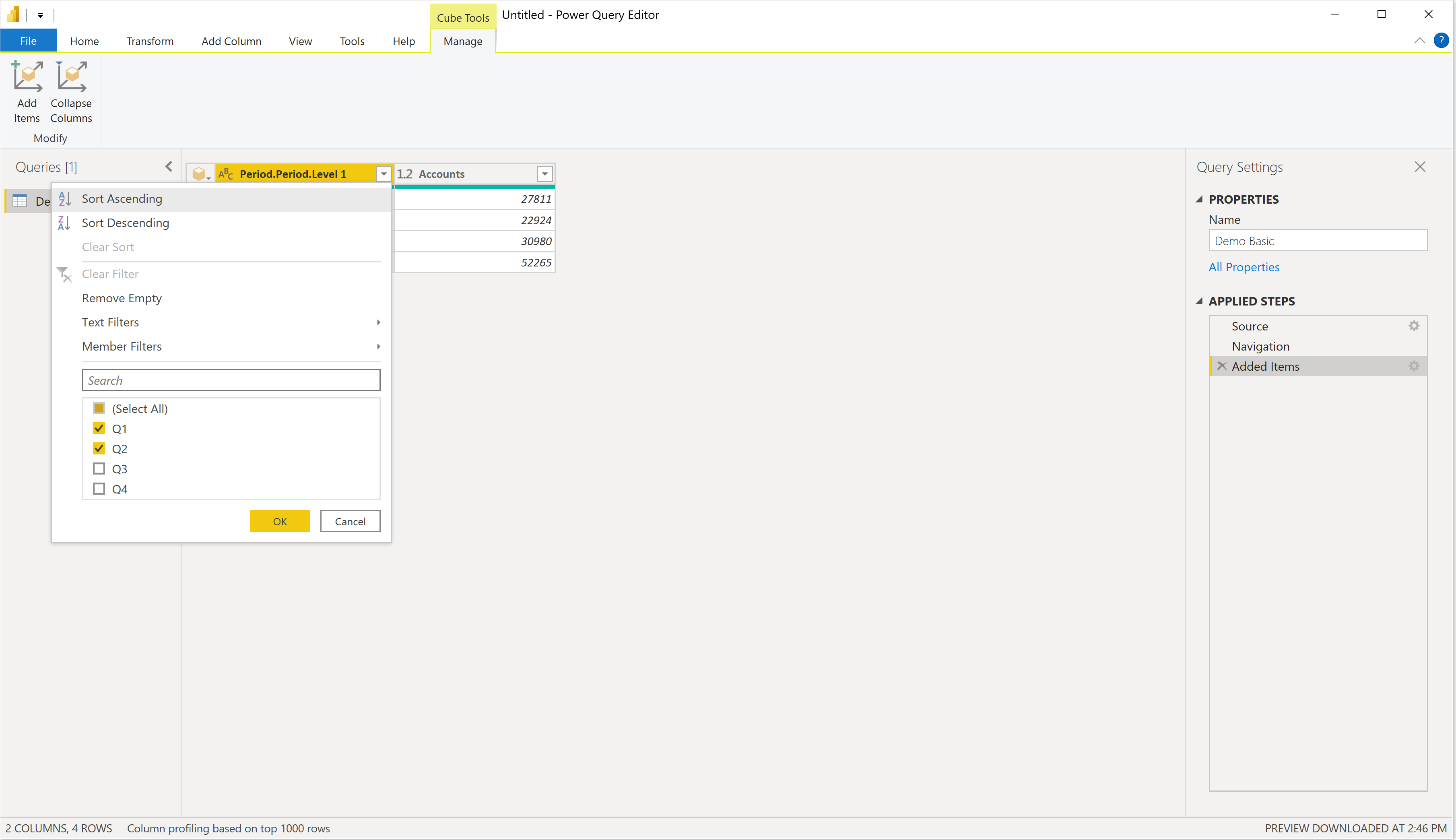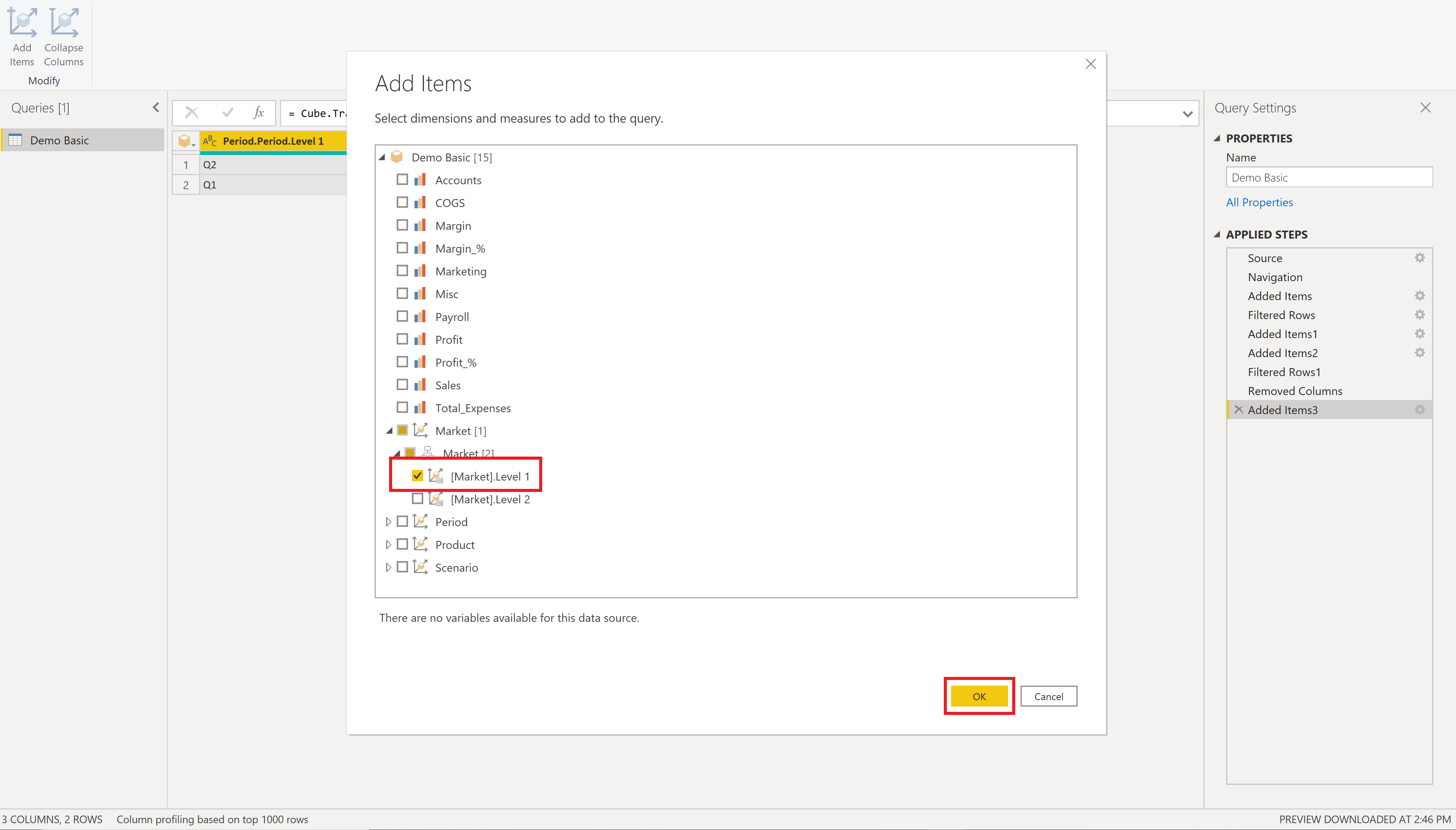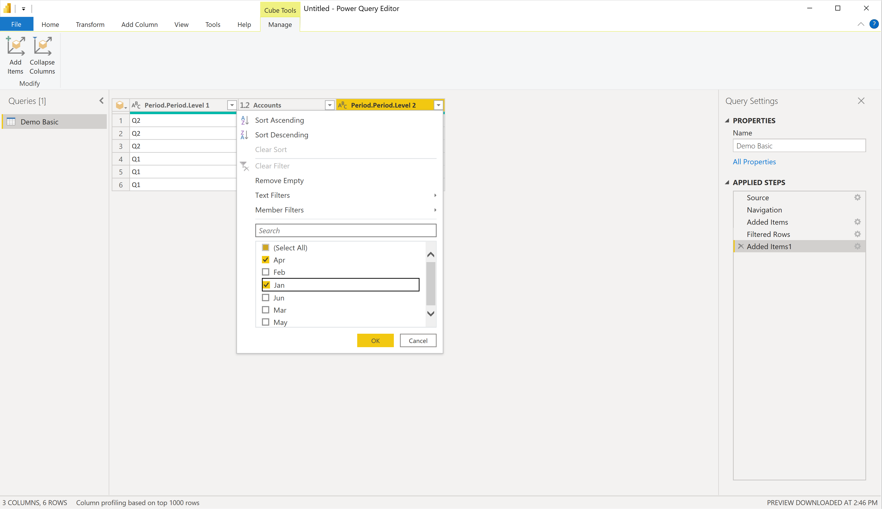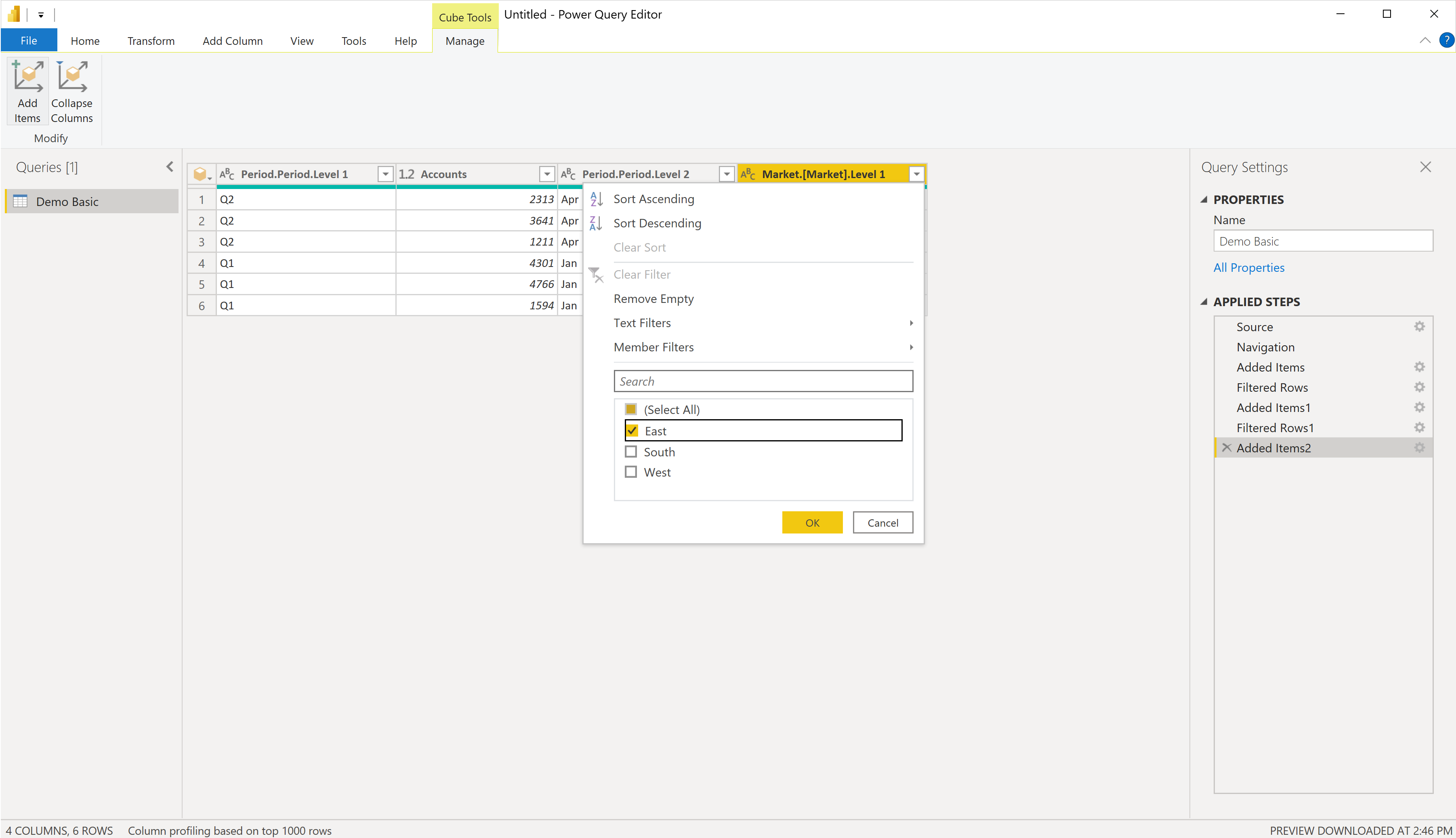 to display the list of available dimension members at this level. Select only the dimension members you need at this level and then select OK to apply the filter.The resulting data is now updated with the applied filter. Applied Steps now contains a new step (Filtered Rows) for the filter you set. You can select the settings button