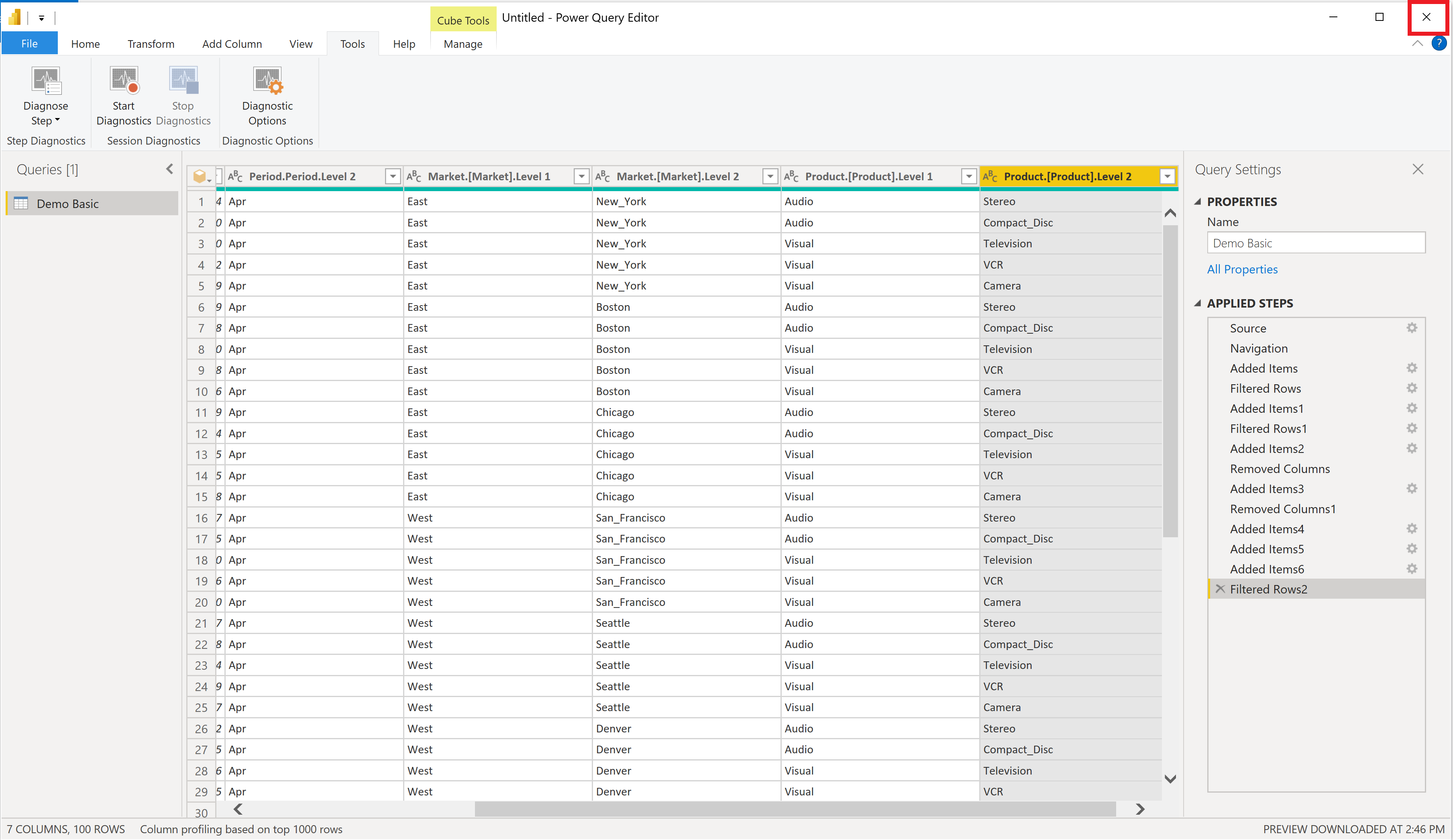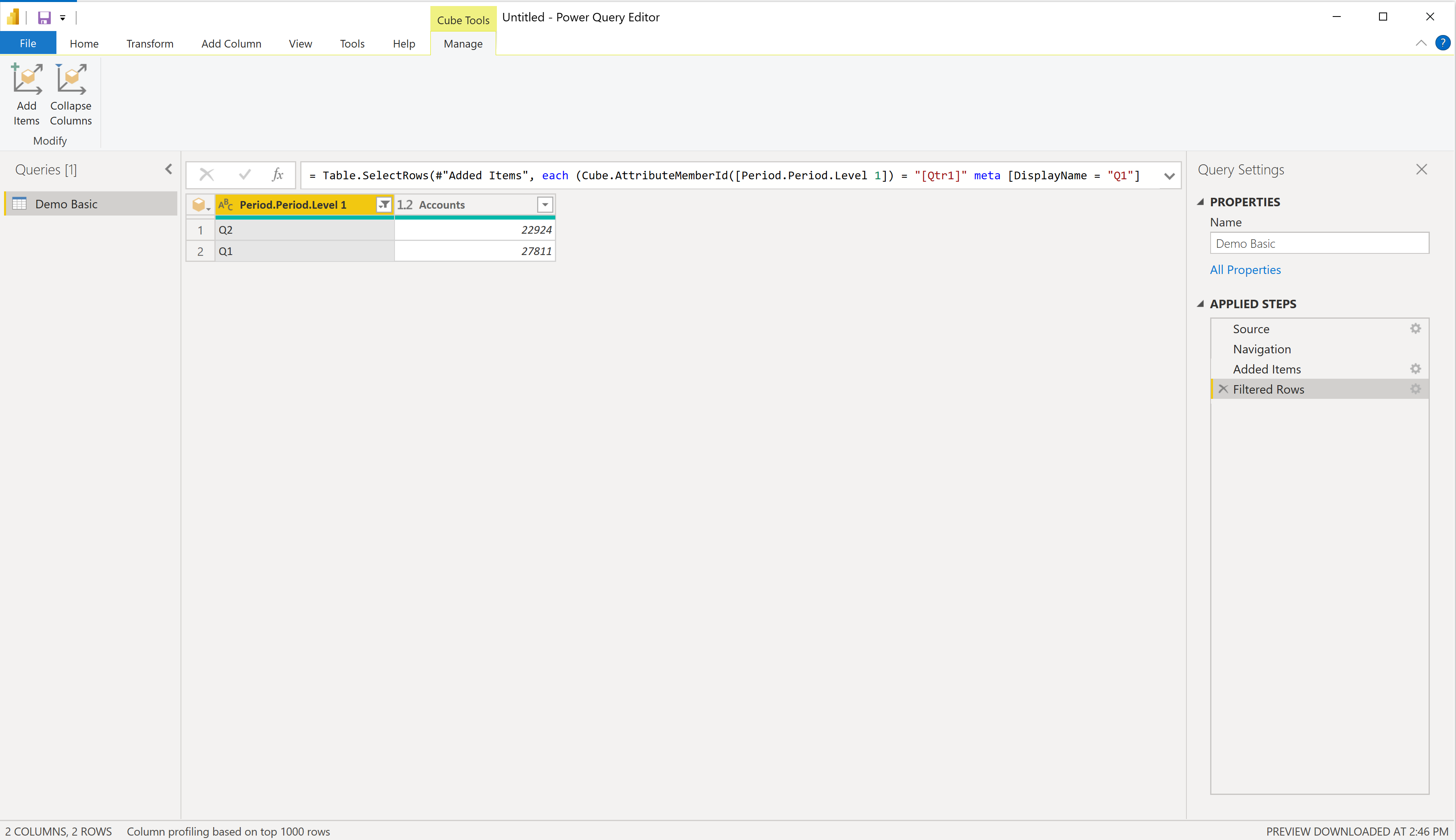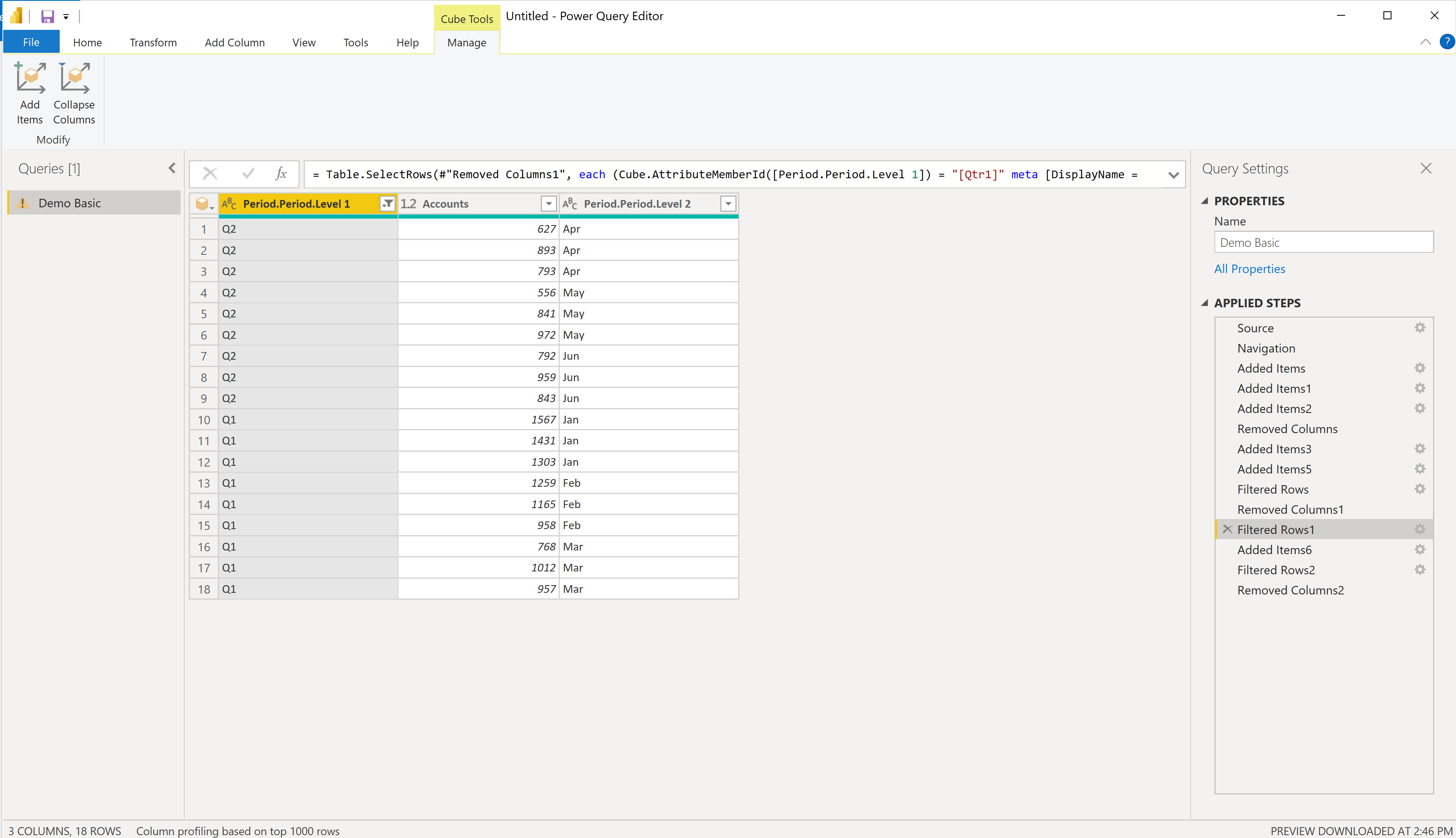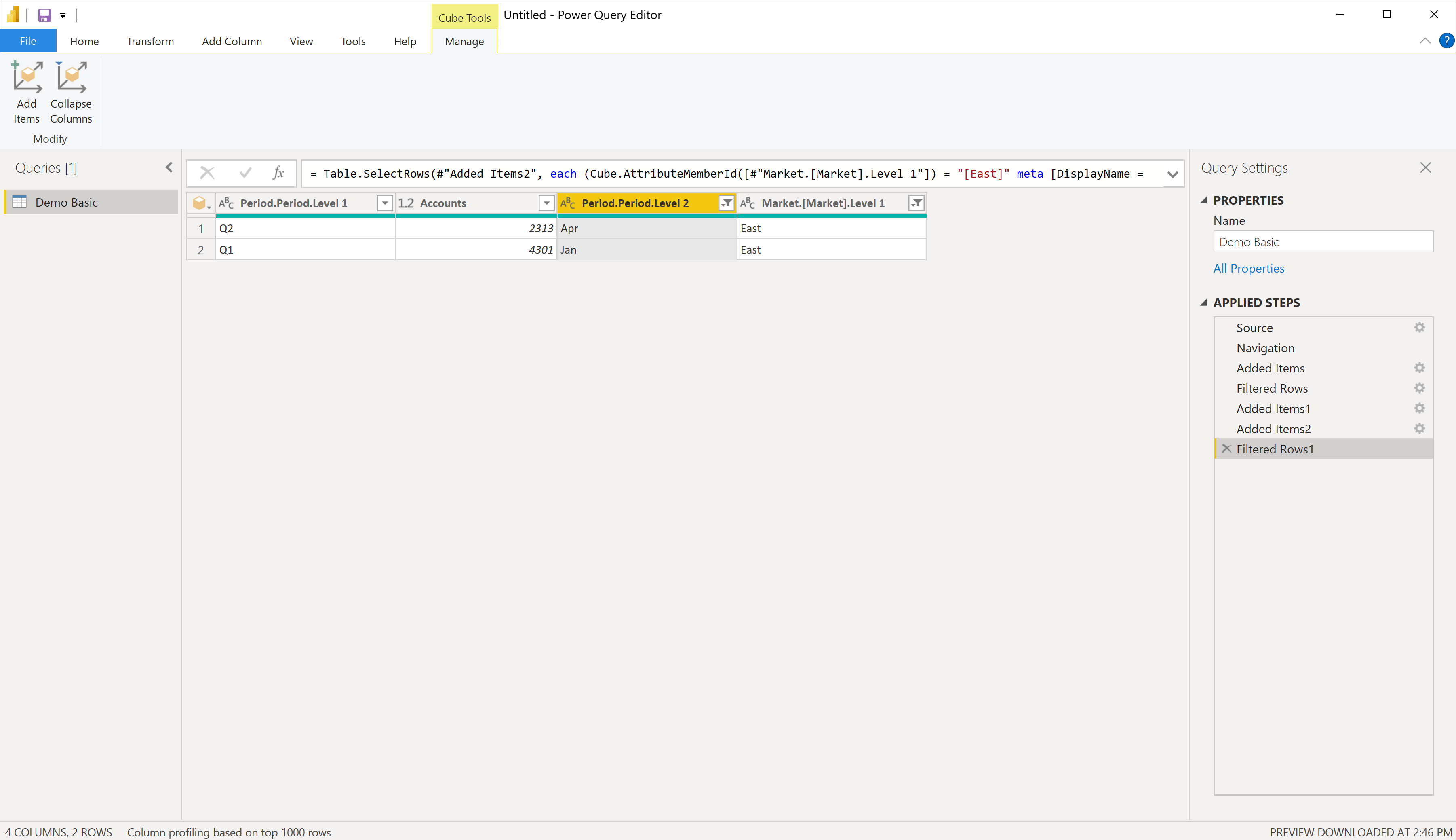 to display the list of available dimension members at this level. Select only the dimension members you need at this level and then select OK to apply the filter.The resulting data is now updated with the applied filter. Applied Steps now contains a new step (Filtered Rows) for the filter you set. You can select the settings button