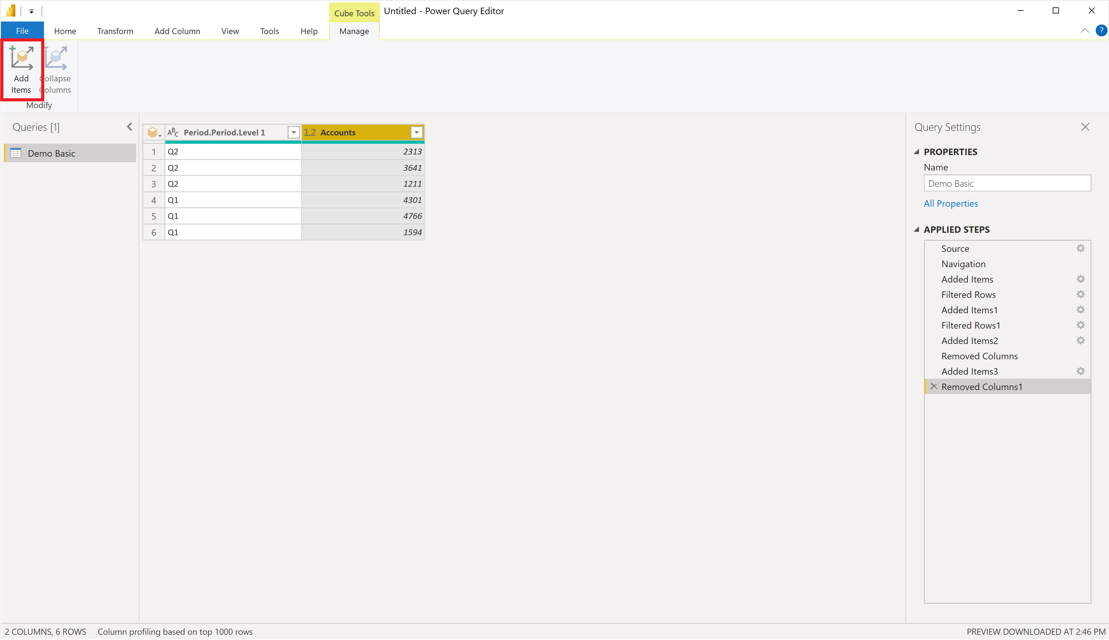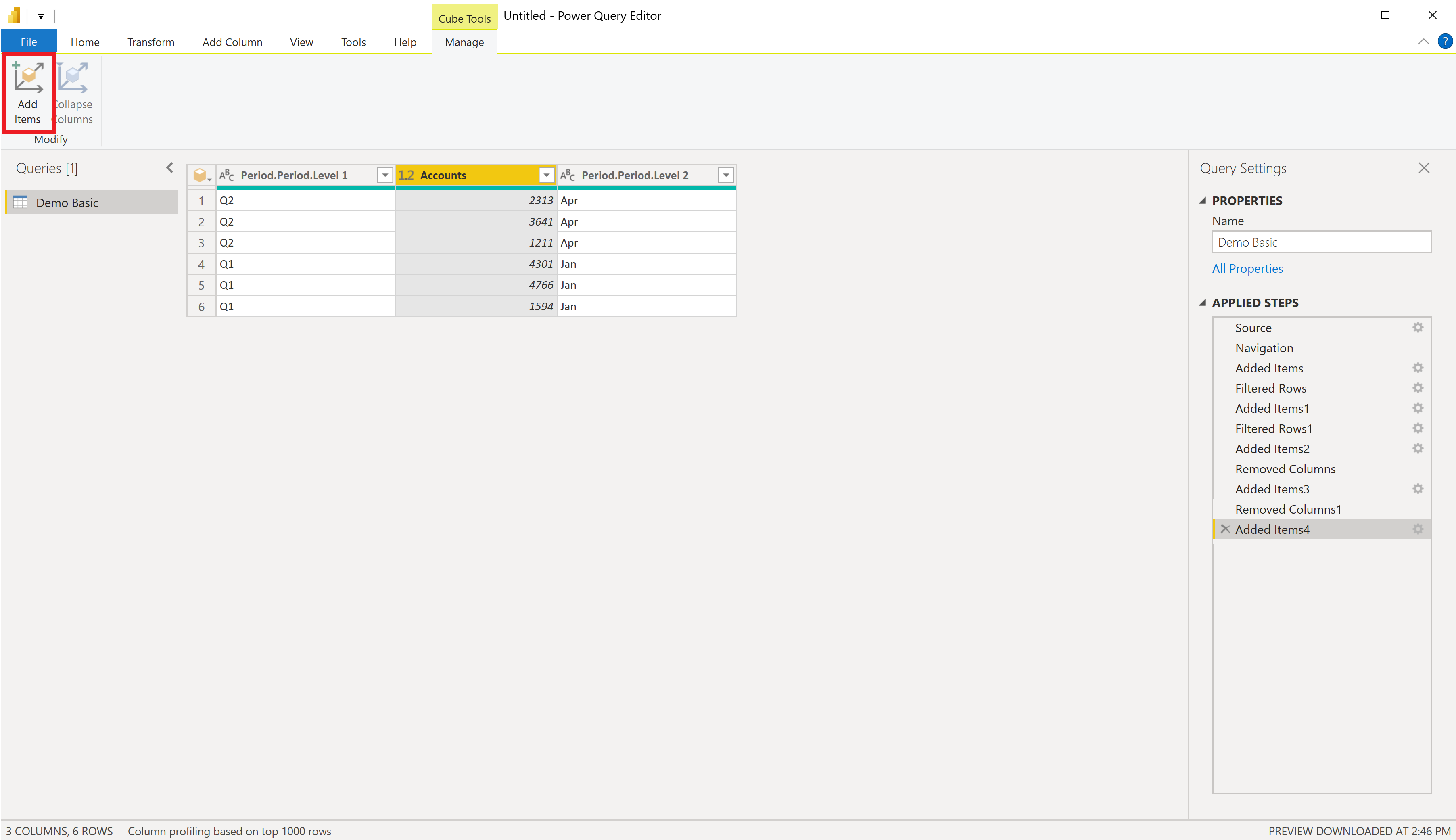 Now let's add a new dimension level by repeating the previous steps. Select Add Items on the ribbon bar again.