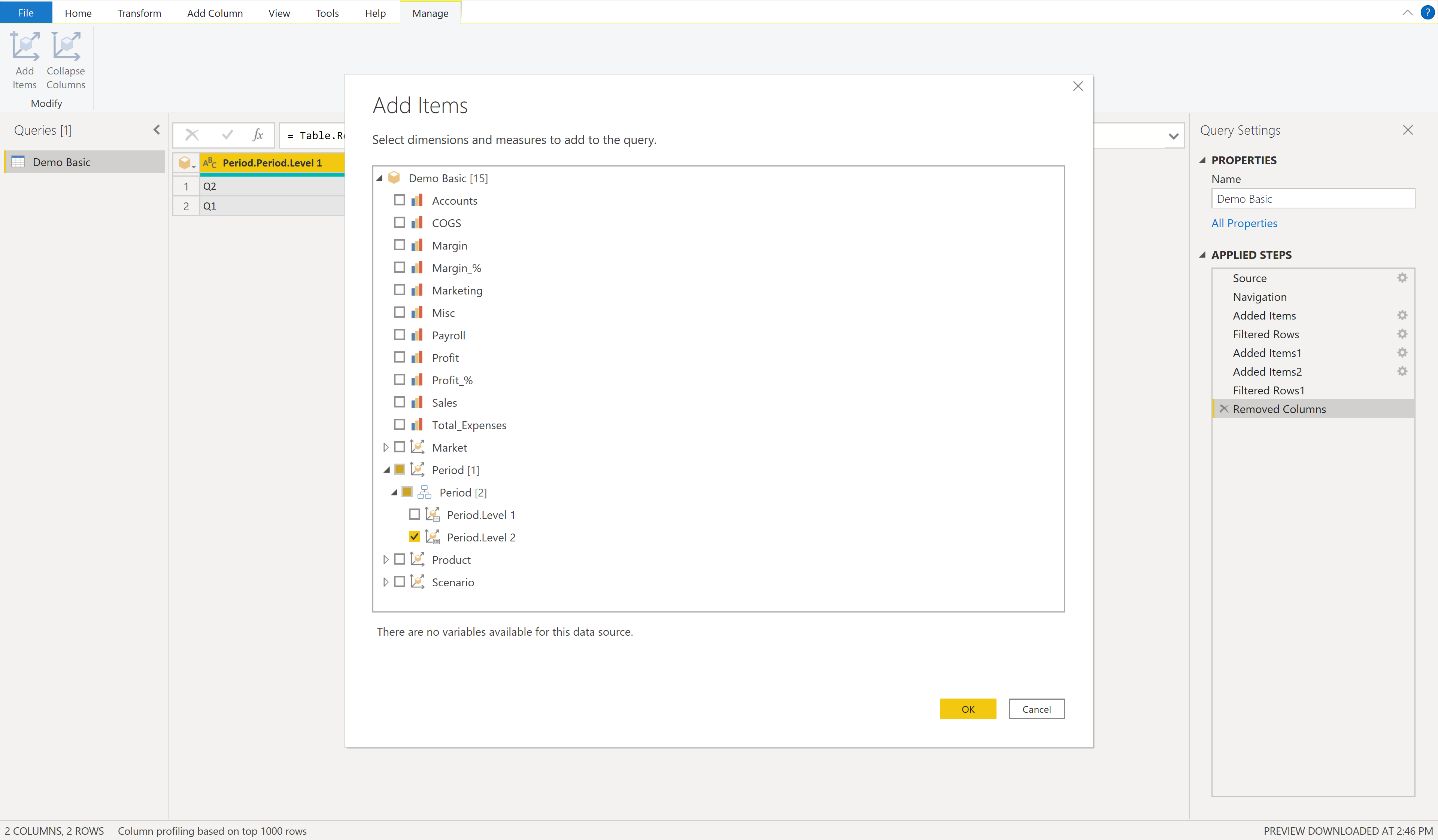 for the step to modify the filter at a later time.Now you'll add a new dimension level. In this case, you're going to add the next level down for the same dimension you initially chose. Select Add Items on the ribbon to bring up the Navigator dialog box.