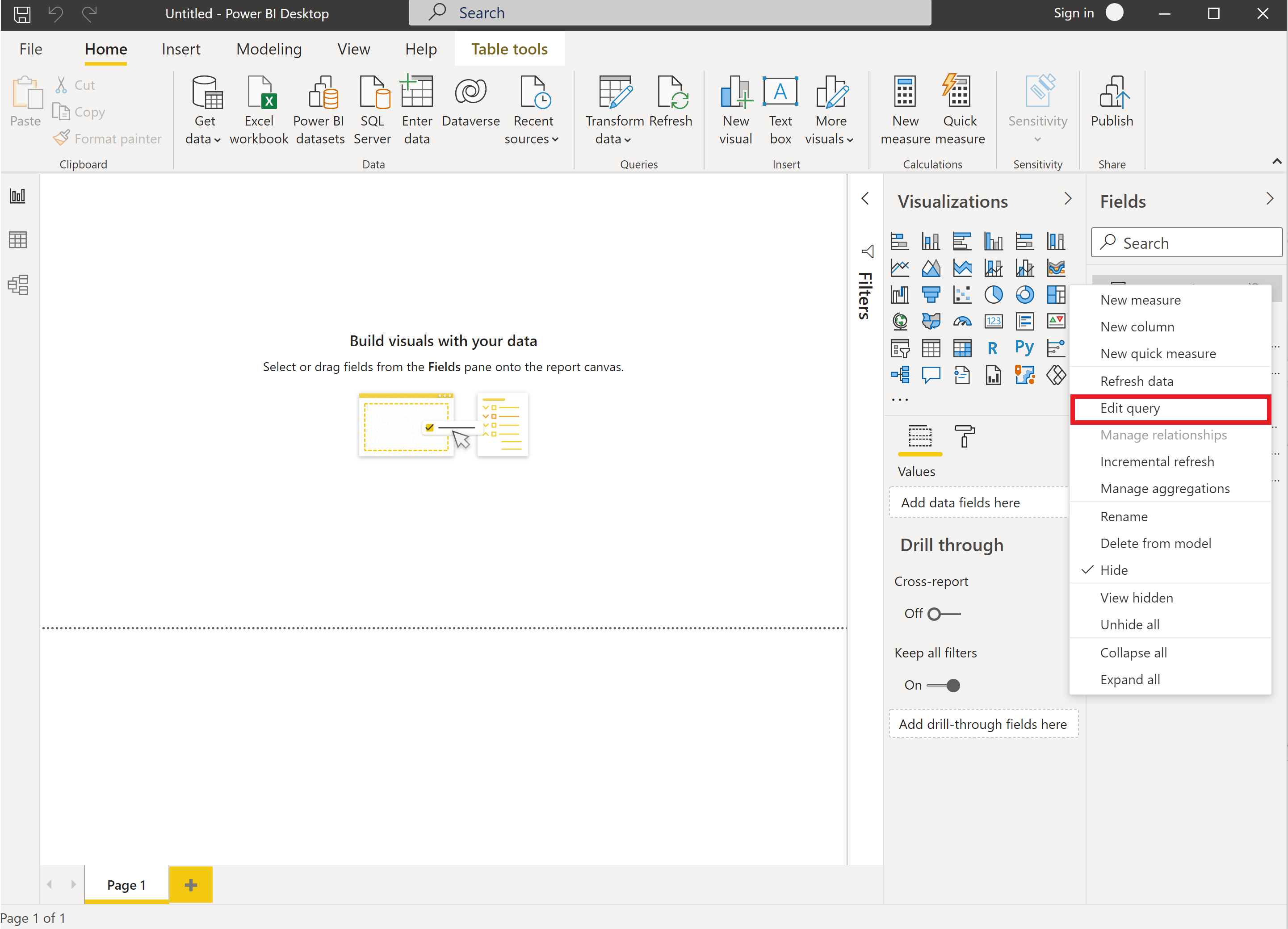 Select Edit Queries on the Power BI Desktop ribbon to start the process.