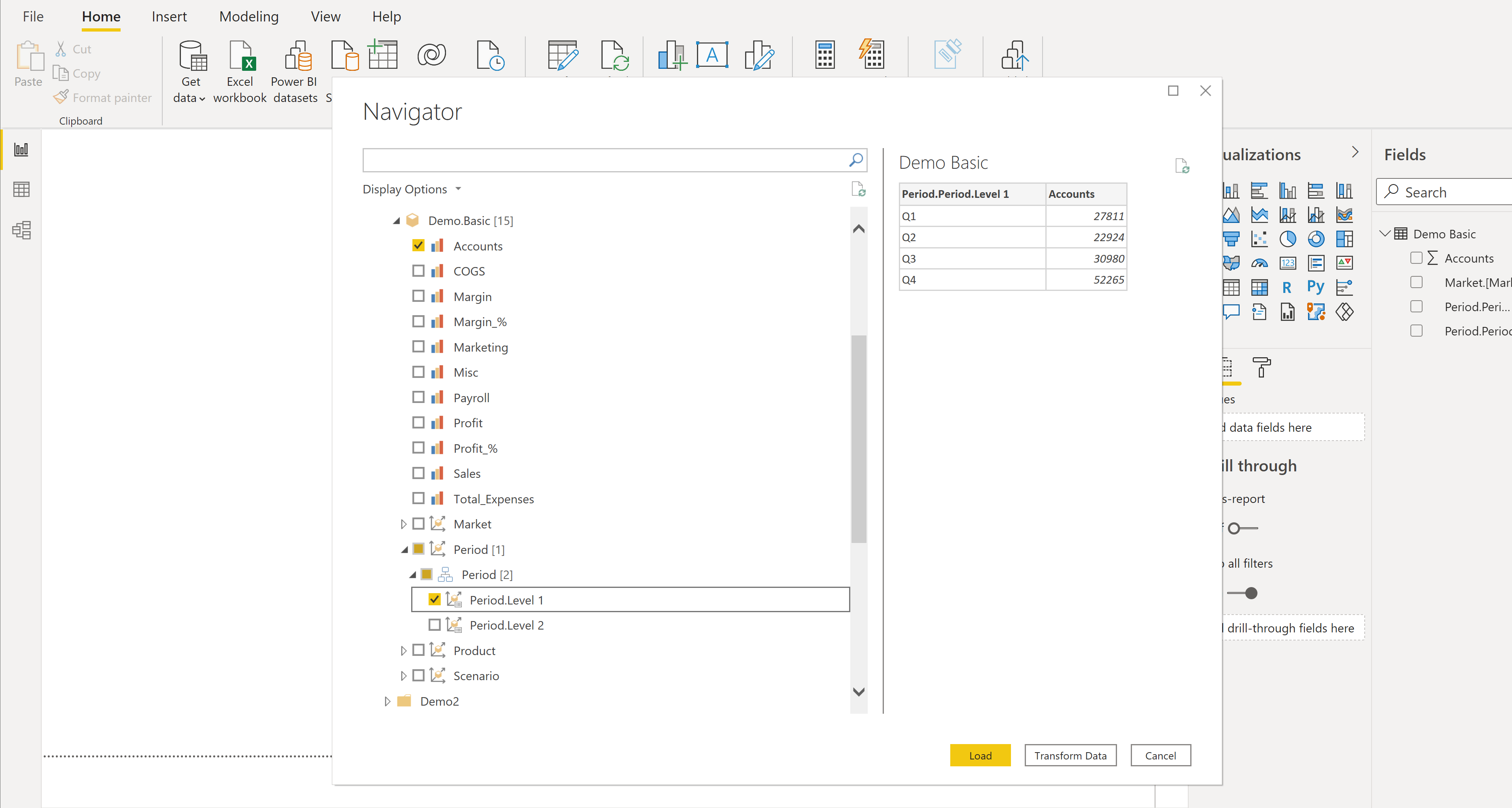 When interacting in import mode with a multidimensional cube data source like Oracle's Essbase, Power Query initially displays the measures, dimensions, and dimension levels in the database Navigator dialog box. However, while Power BI makes it easy to select and visualize data it can, at times, lead to retrieving too much data from the server.