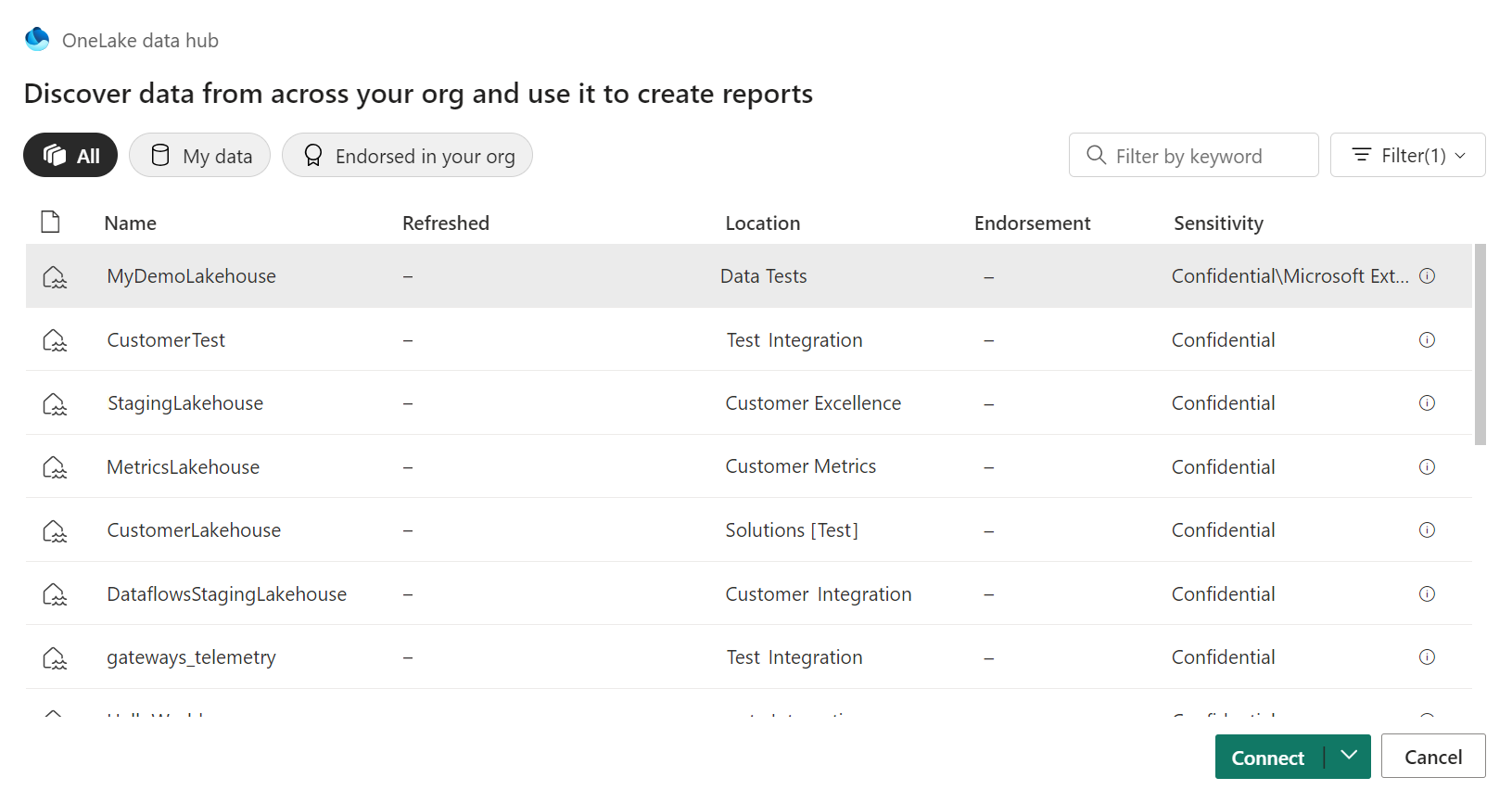 In the OneLake data hub, select the lakehouse you want to connect to. Optionally, you can use the All, My data, or Endorsed in your org buttons to filter the Lakehouses displayed in the dialog. Then select Connect.