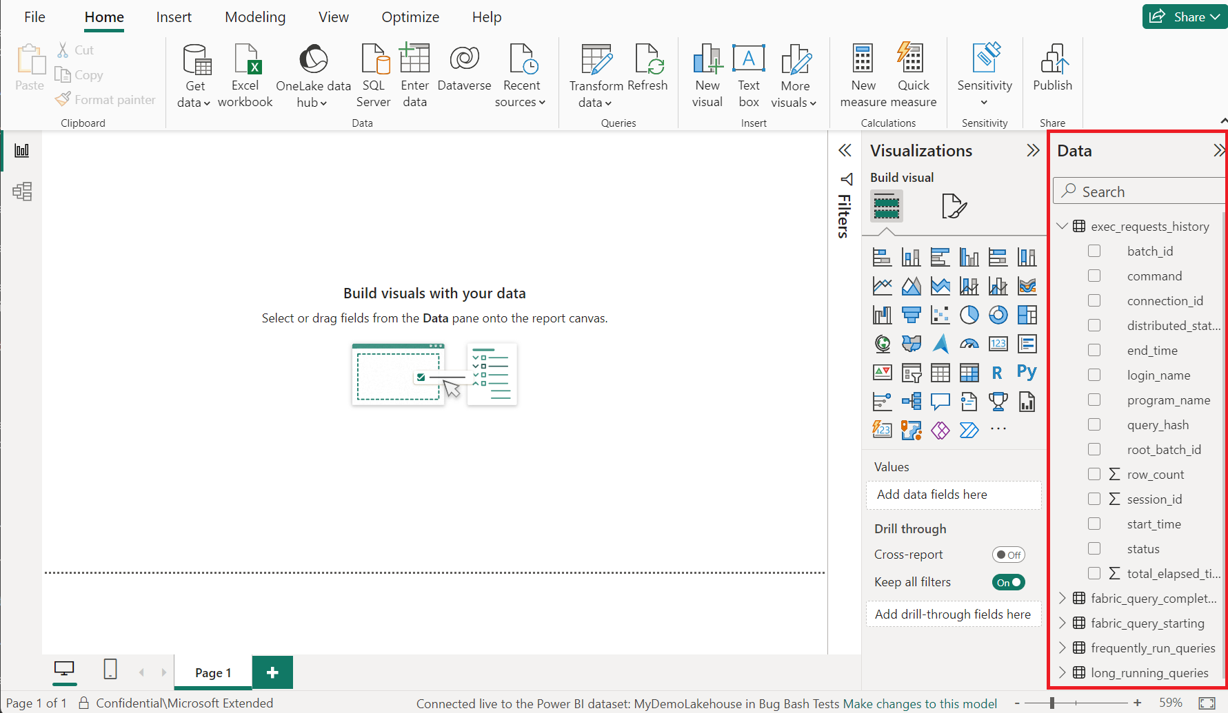 Select the data you want to build visuals with from the Data pane in Power BI Desktop.