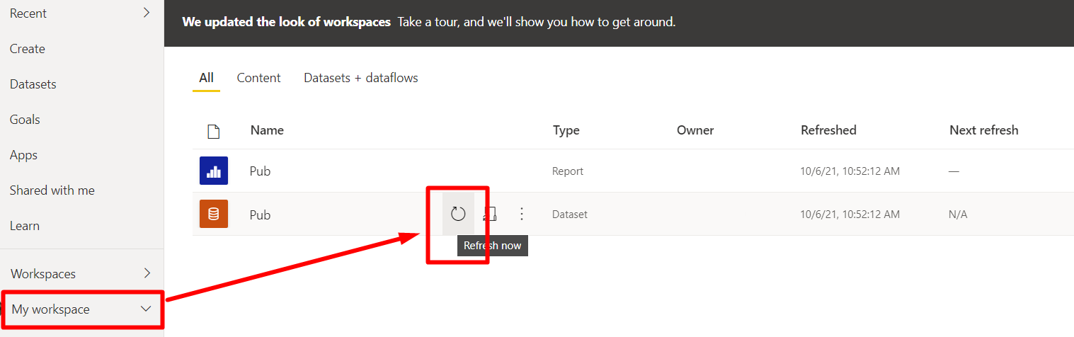 Select the Publish button in Power BI Desktop to publish data, reports, and data model to the cloud-based Power BI service.