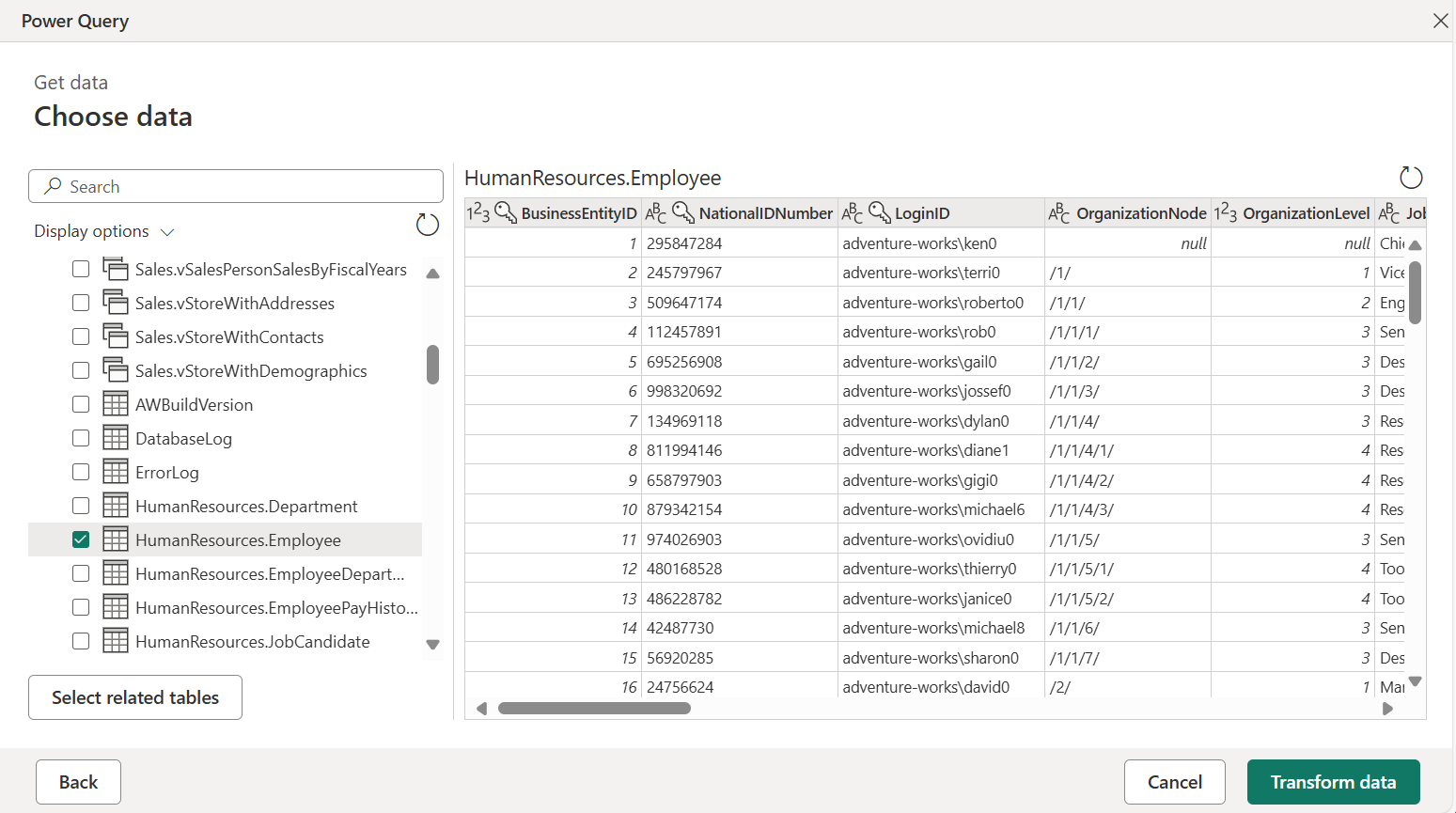 In Navigator, select the database information you want, then either select Load to load the data or Transform Data to continue transforming the data in the Power Query editor.