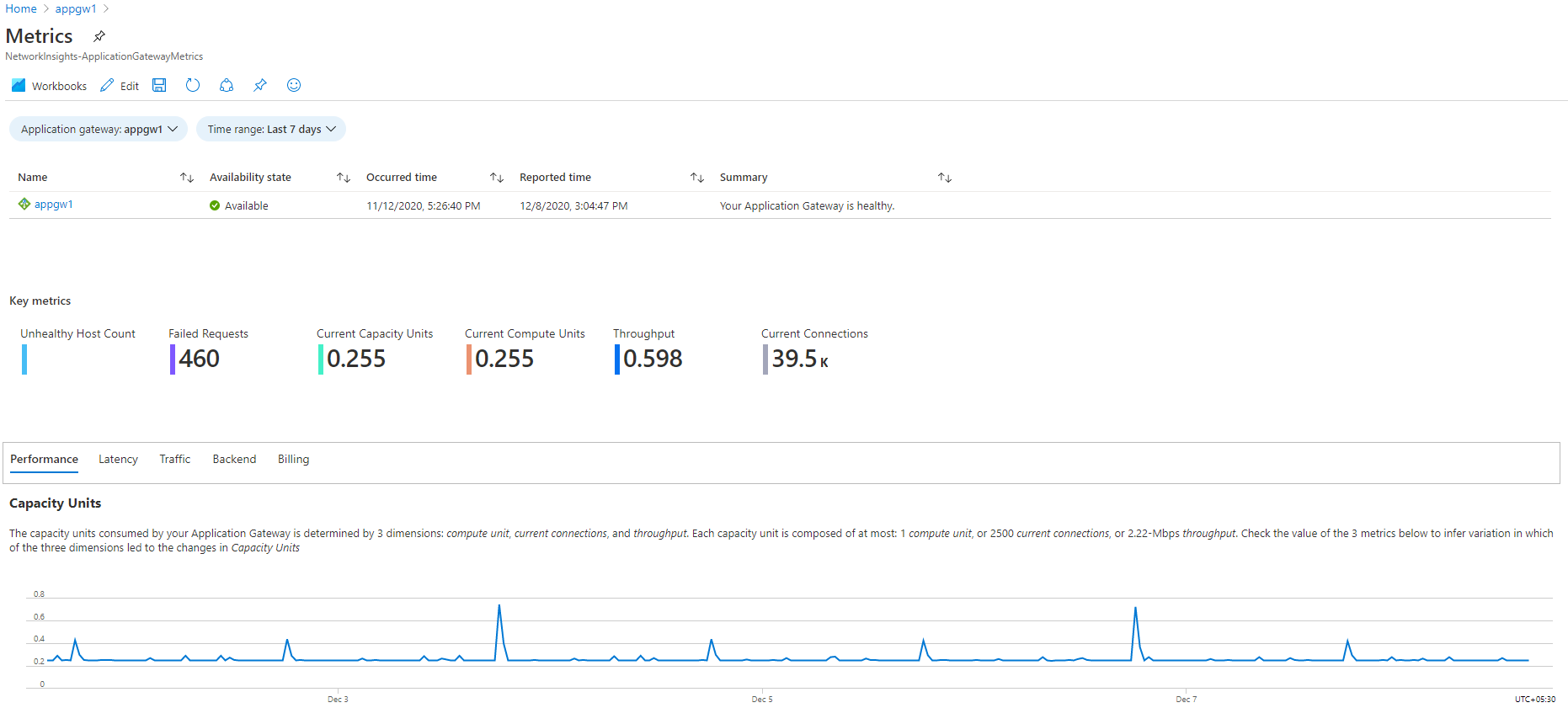 The View detailed metrics tab opens the pre-populated workbook that summarizes the data from your Application Gateway resource.