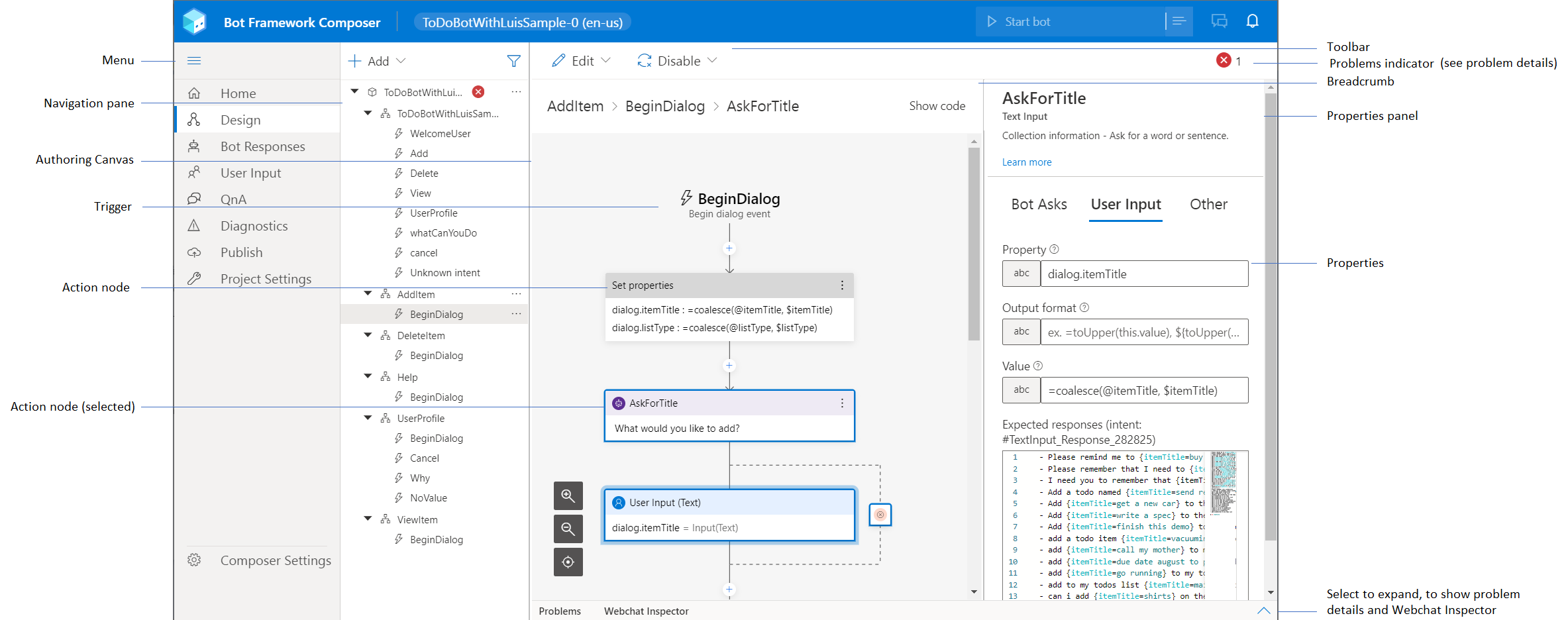 • Composer streamlines your bot project's codebase and provides a more accessible visual design surface that provides a unified canvas to author dialogs and responses, along with language and QnA resources.