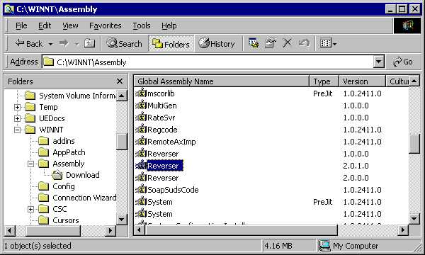 After installing these Reverser assemblies, you can then examine the assembly cache by navigating to the \WindowsDirectory\Assembly directory, and using the cache viewer shell extension:
