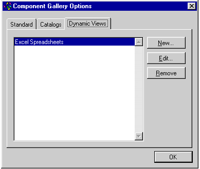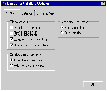 When you click Options in the Component Gallery window, a three-tabbed dialog box appears wherein you can set certain Component Gallery properties.