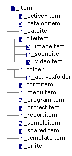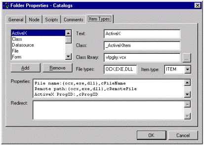 Item Type: A category that defines the behavior of the items in the catalog. The default item types are stored in the home( )+"\Gallery\VfpGlry.VCX" class library, and are configurable for each catalog. (For each catalog, see the Properties dialog box, available on the Shortcut menu). The root catalog, always named "Catalogs," contains the default item types that all catalogs inherit.