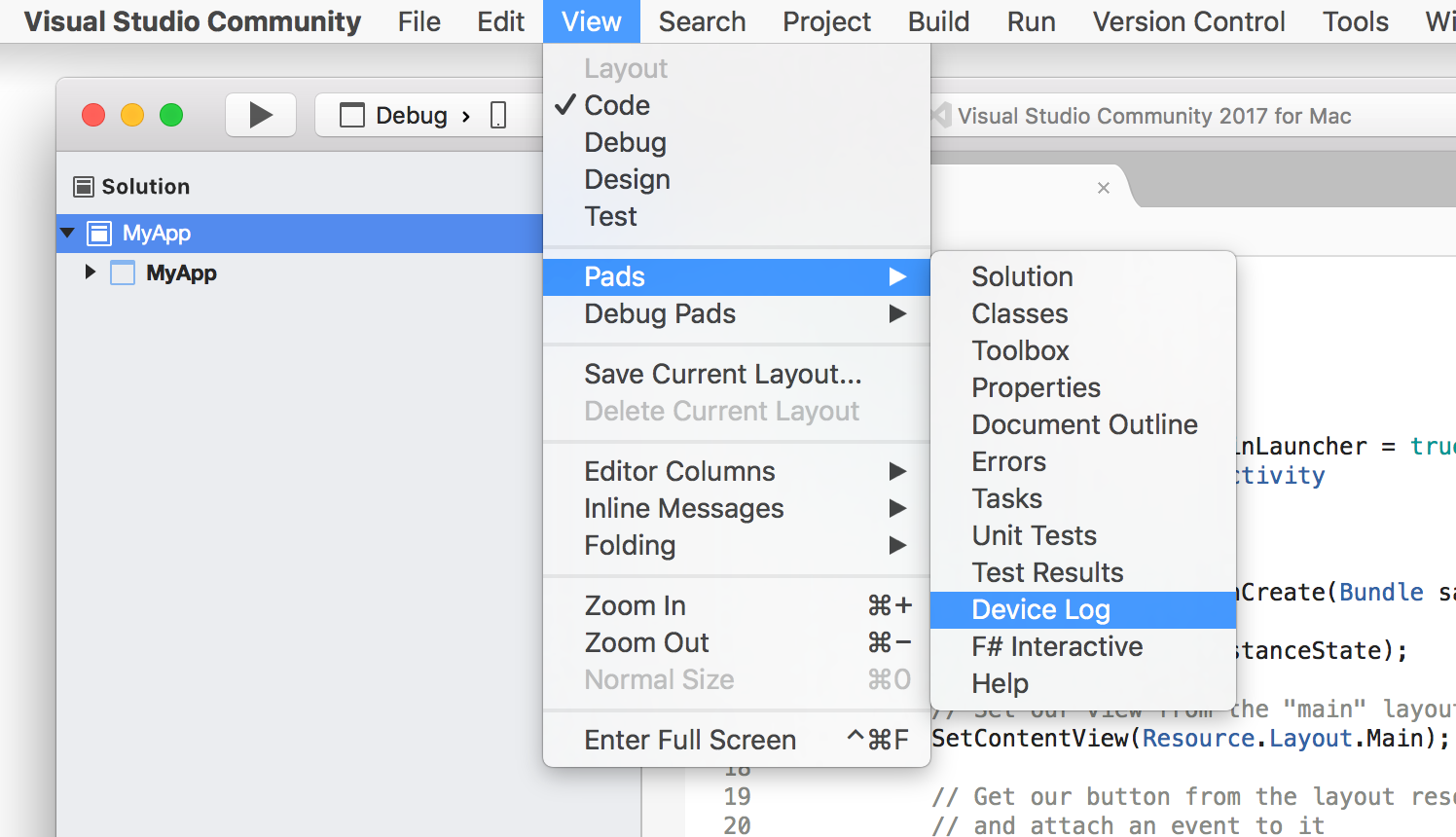 - View > Other Windows > Device Log
