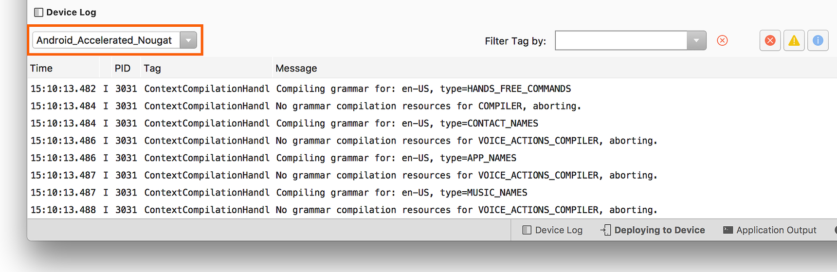 To open the Device Log tool, click Device Log (logcat) icon on the toolbar: