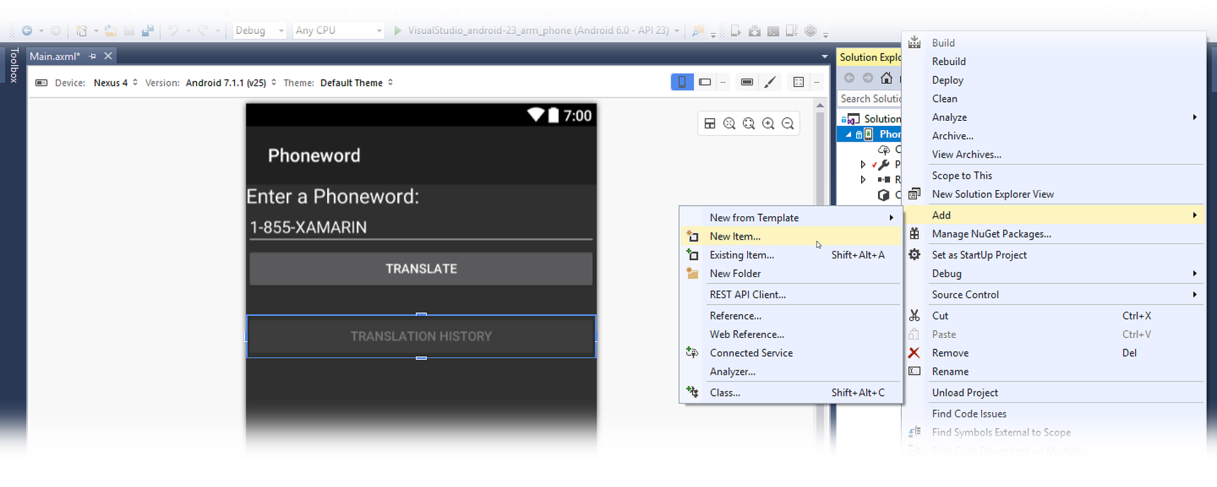 Create a second Activity to power the second screen. In the Solution Explorer, right-click the Phoneword project and choose Add > New Item...: